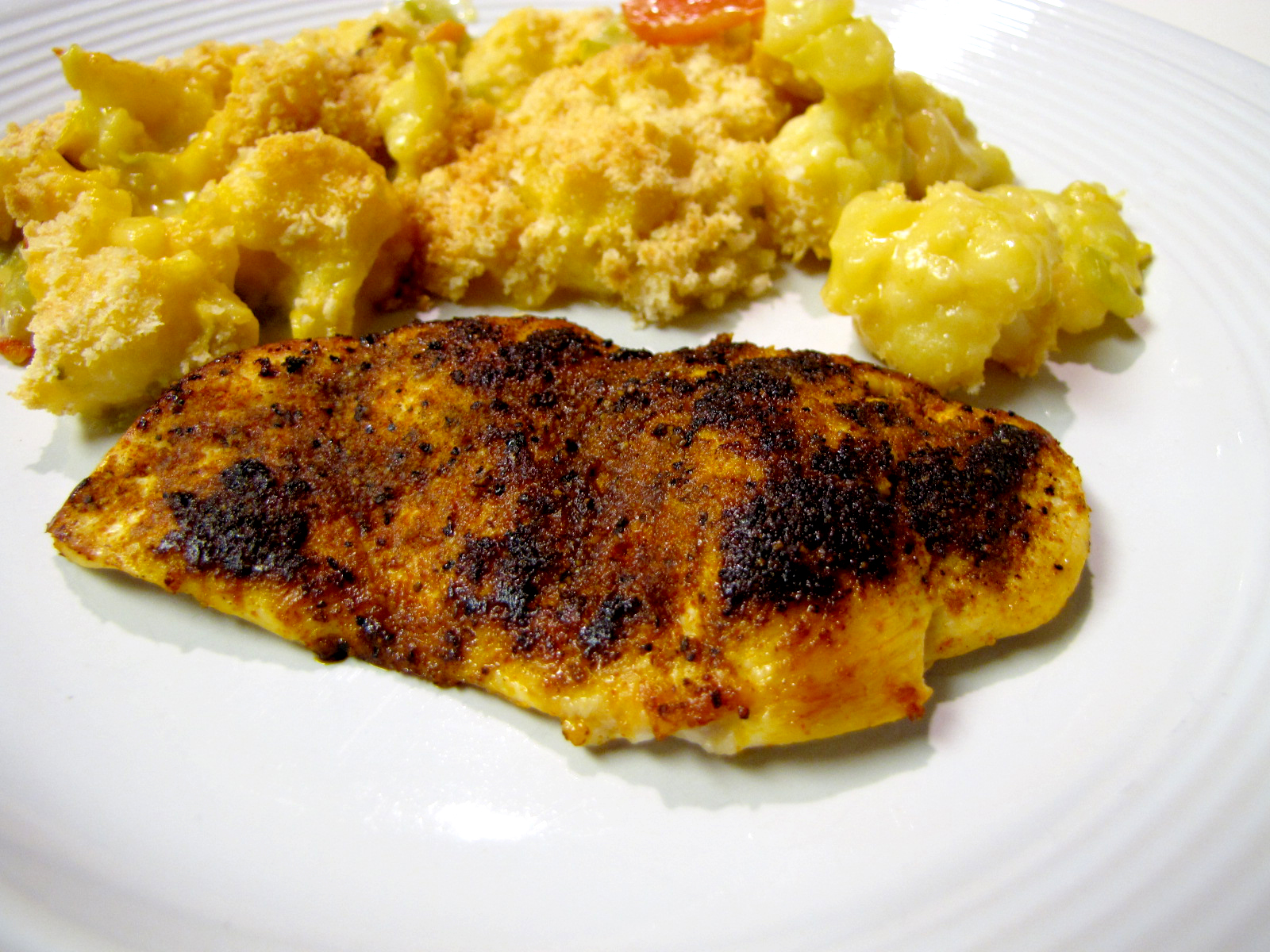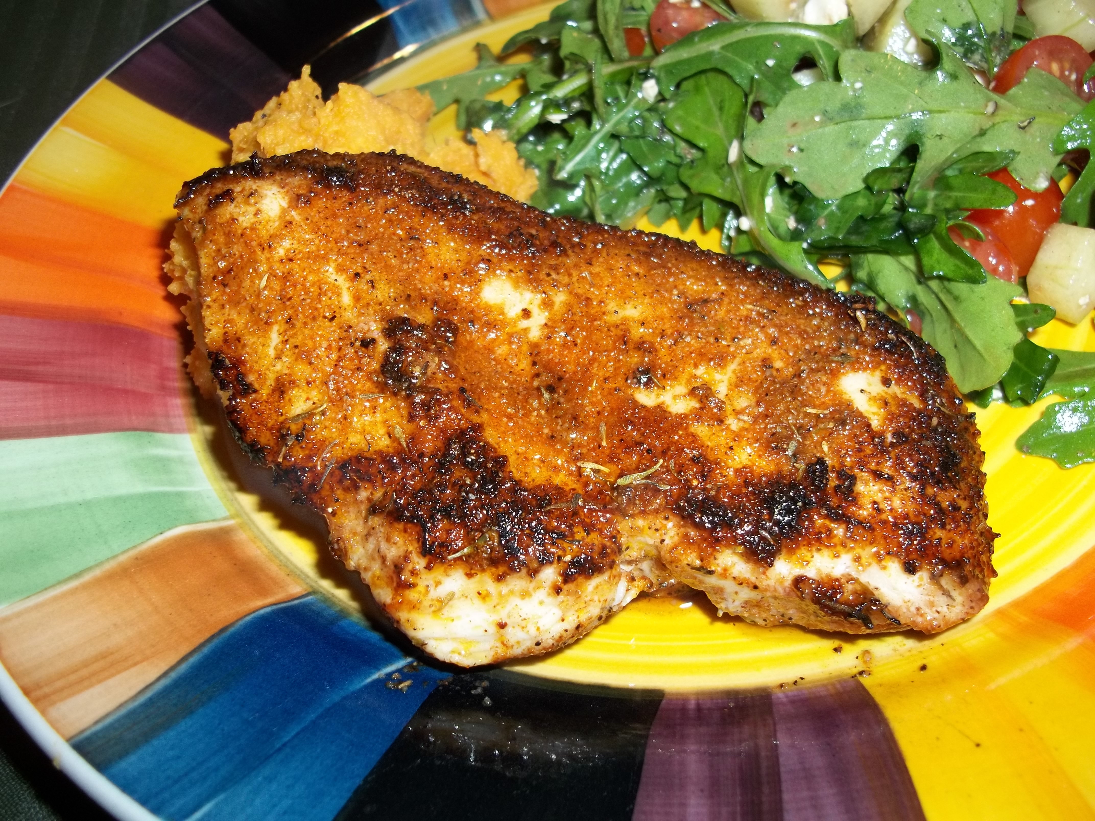 6 chicken breasts (skinless and boneless) 6 tablespoons butter (optional) or 6 tablespoons margarine (optional) 1 teaspoon garlic powder 2 teaspoons onion powder 1 teaspoon cayenne pepper 2 teaspoons sweet paprika 1 1?2 teaspoons salt 1?2 teaspoon white pepper 1 teaspoon ground black pepper 1?4 teaspoon ground cumin 1 teaspoon dried thyme
