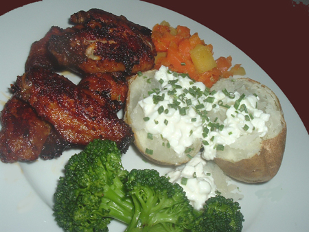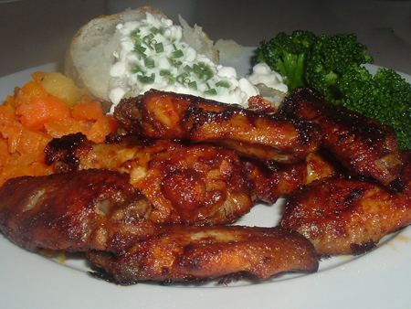In a large bowl mix together first 8 ingredients until well combined. Add in wings; toss to coat (make certain to cover the wings completely with the sauce). Refrigerate for 8-24 hours (24 hours is better). Set oven to 350F. Set oven rack to lowest position. Place the wings on a large greased jelly-roll pan. Bake for about 25-30 minutes or until cooked through. OPTIONAL: for a crispy skin broil under broiler heat for about 4 minutes (can turn if desired).