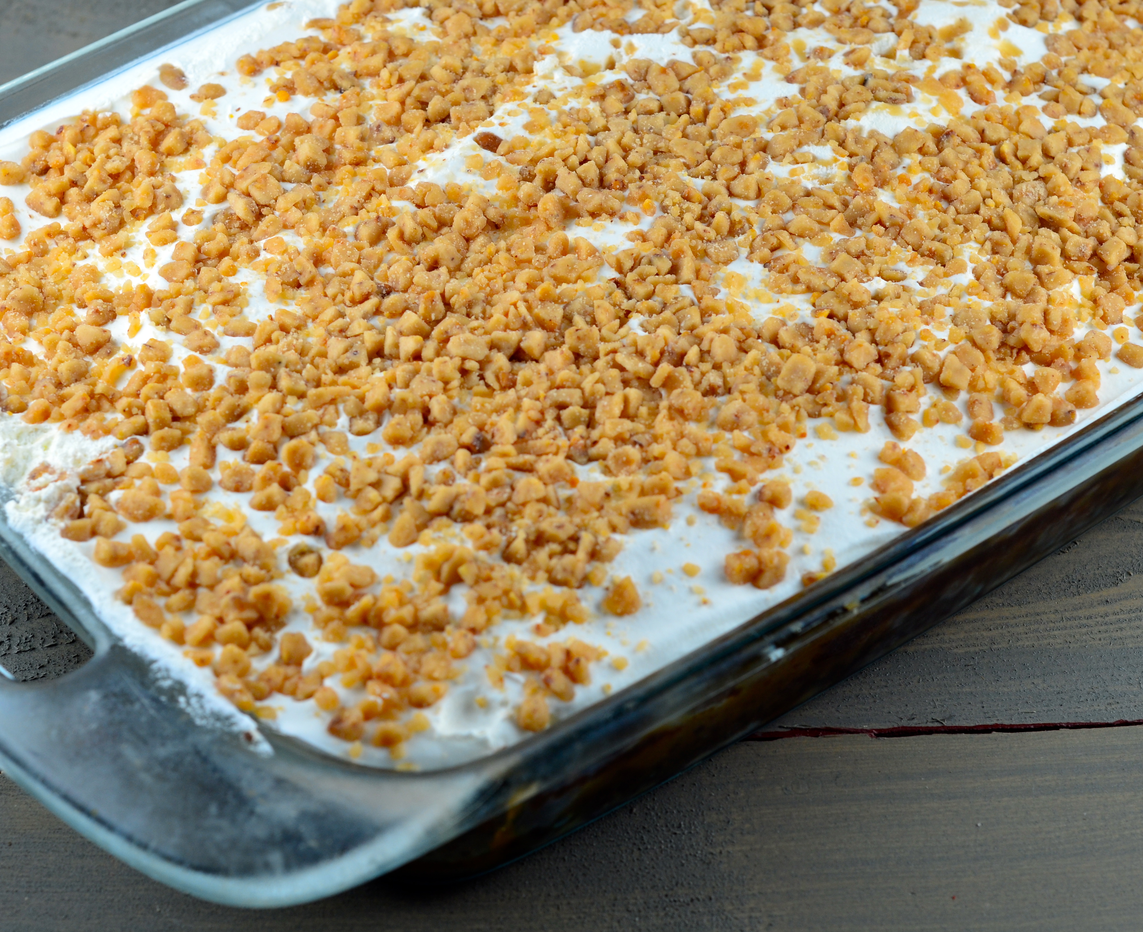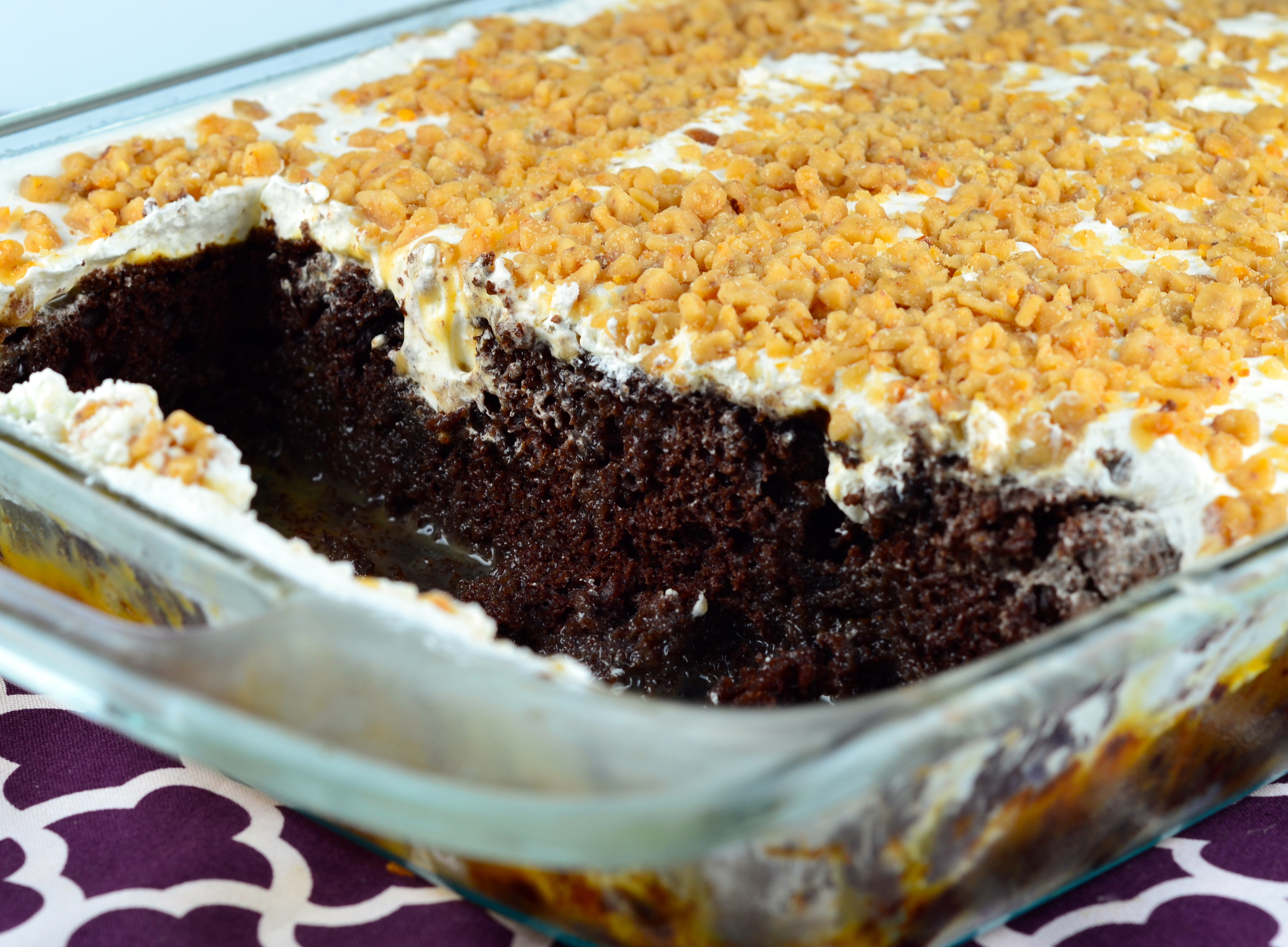 10 1?4 ounces German chocolate cake mix 1 1?4 cups water 1?3 cup oil 3 eggs 1 (14 ounce) can sweetened condensed milk 1 (16 ounce) jar caramel topping (OR butterscotch topping) 8 ounces Cool Whip 1 (8 ounce) bag toffee pieces (or bits)