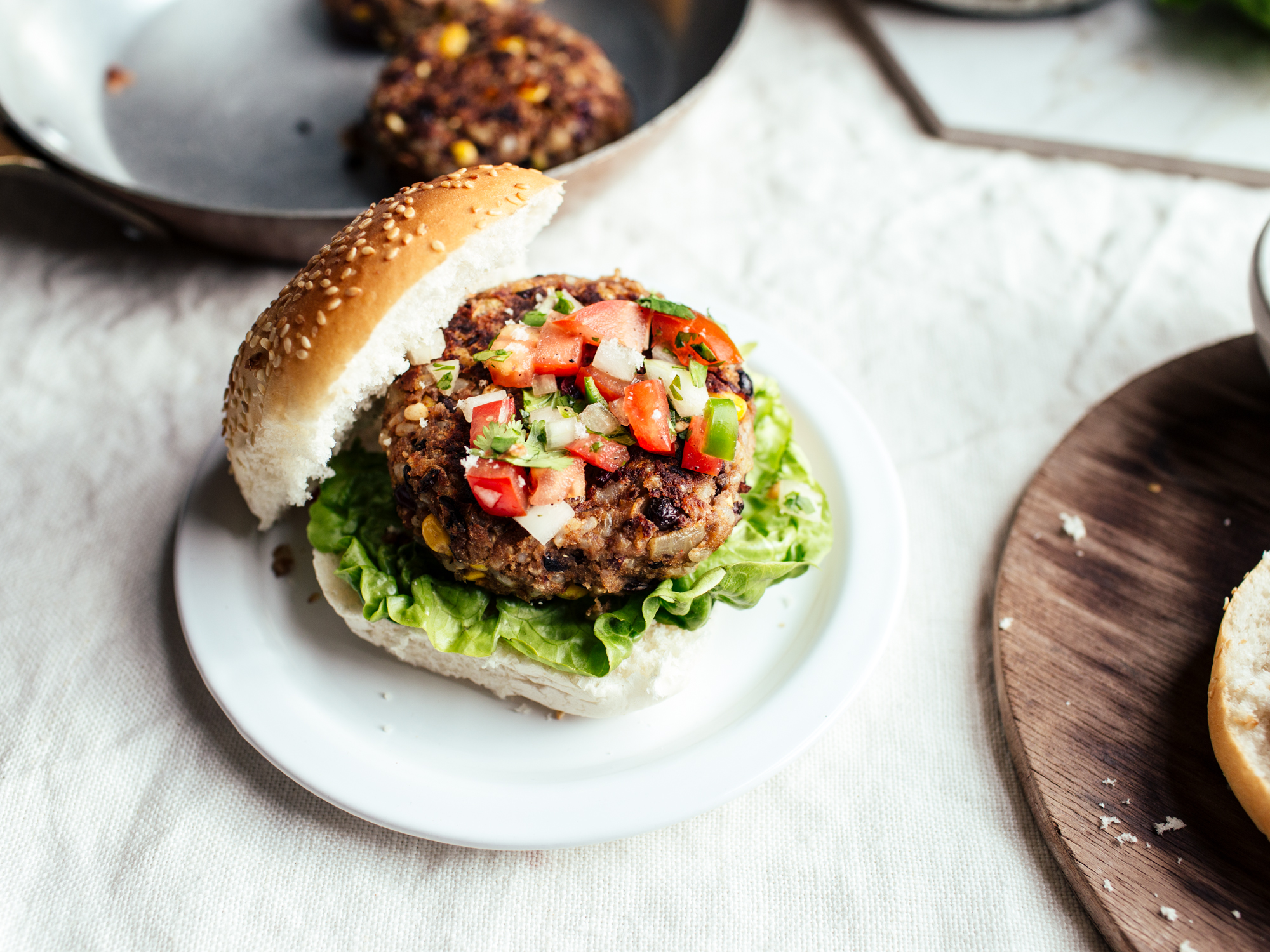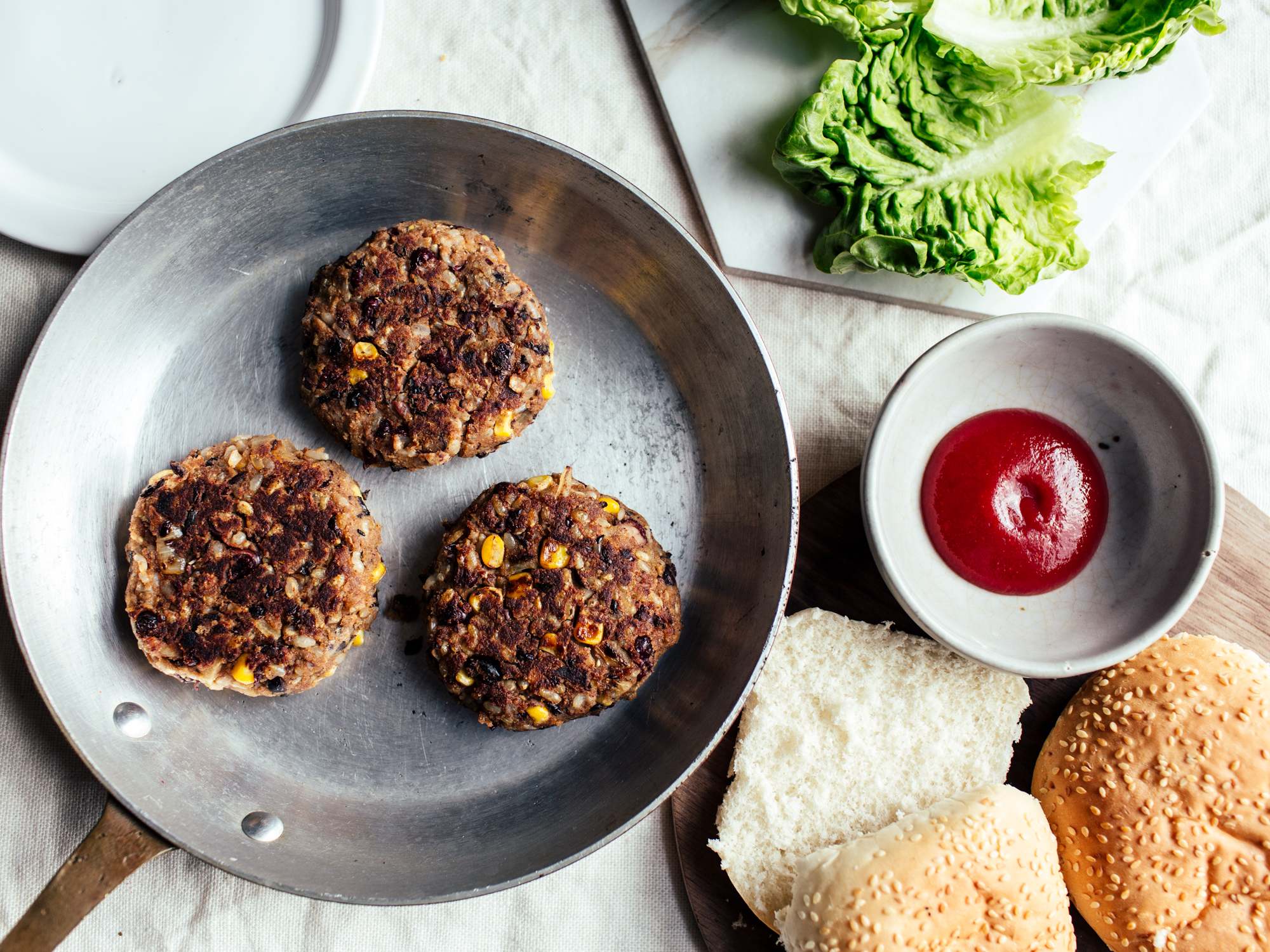 In a small pot, combine rice and 1 cup water; bring to a boil, and then turn down to medium heat and cook 20 minutes.In a saucepan, heat a little oil over medium heat and saute the onion and garlic about 5 minutes, until the onion is translucent and soft. Add the corn and spices and cook until the corn is defrosted, another 5 minutes. In a medium bowl, mash the drained beans with a fork or your fingers. Add the rice, corn, and onion; combine, mashing it with your fork as you go. Taste and adjust the spices now, because once you put the egg in you could risk salmonella. Add the egg and mix in well. Add the breadcrumbs. Form into patties by patting the desired amount of mixtured into a flat round. (I used a giant cookie scoop to make sure all the patties were the same size, but you can just divide the mixture into six sections). Cook about 2 minutes on each side (if you can't flip the patty without breaking it, it's probably not finished cooking).