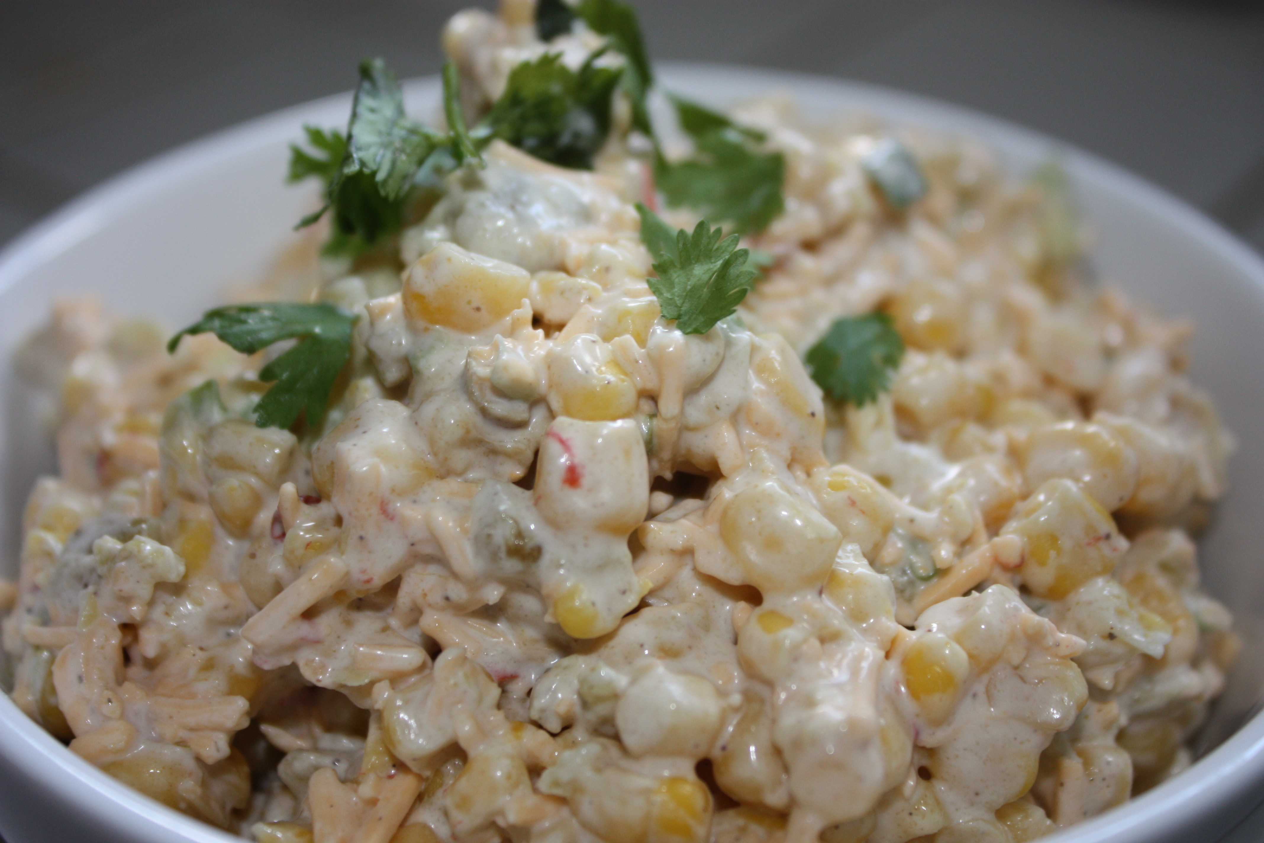 3 (11 ounce) cans mexicorn whole kernel corn, drained 2 cups shredded cheddar cheese 1 (7 ounce) can diced green chilies 2?3 cup green onion, chopped 3?4 teaspoon ground cumin 1?2 teaspoon black pepper 3?4 cup mayonnaise 1 (8 ounce) container sour cream