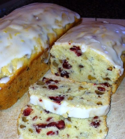 BREAD 2?3 cup butter, softened 1 1?2 cups sugar 3 tablespoons lemon juice 2 tablespoons lemon peel, grated 4 eggs (or can use 2 cups egg-substitute) 3 cups all-purpose flour 2 teaspoons baking powder 1 1?2 teaspoons salt 1 cup low-fat milk 2 cups dried cranberries 1 cup walnuts, chopped (or almonds) GLAZE 1?4 cup powdered sugar 1?4 cup lemon juice
