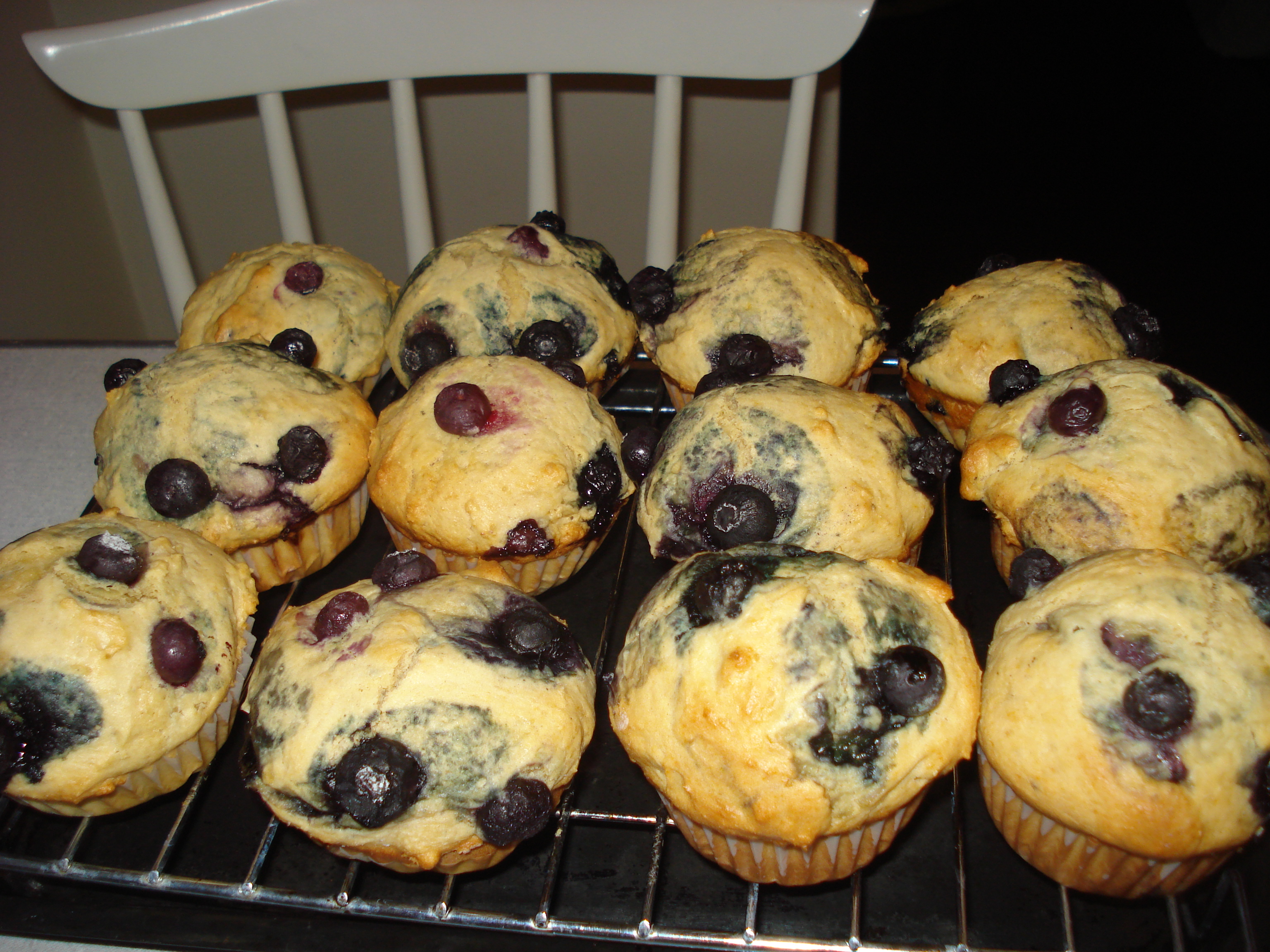 In a mixing bowl, beat eggs. Gradually add sugar. While beating, slowly pour in oil; add vanilla. Combine dry ingredients; add alternately with the sour cream to the egg mixture. Gently fold in blueberries. Spoon into greased muffin tins. Bake at 400F for 20 minutes.