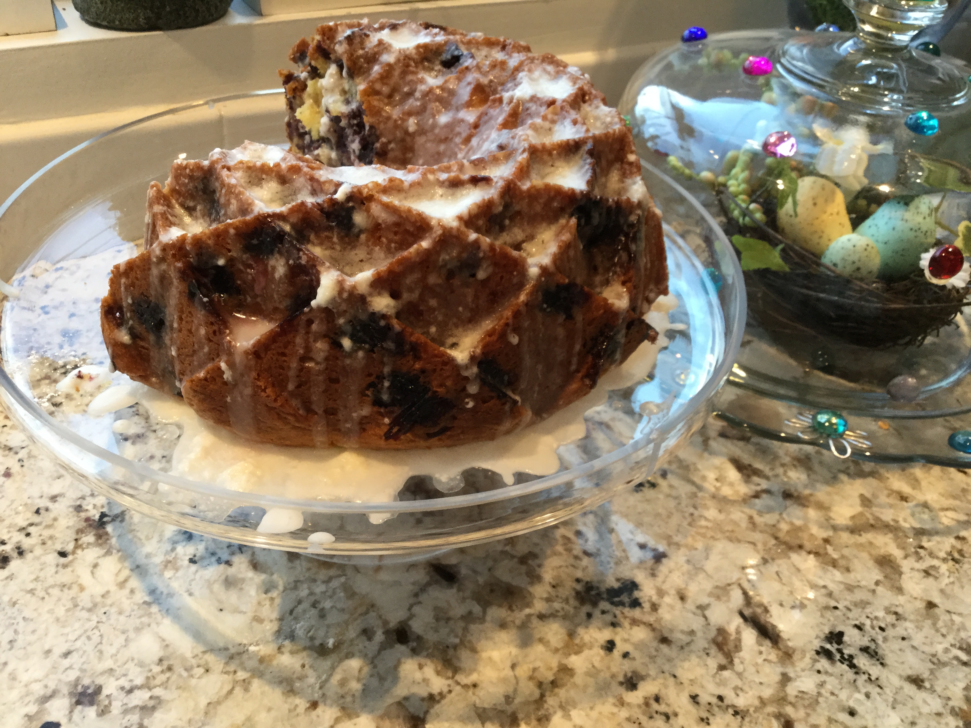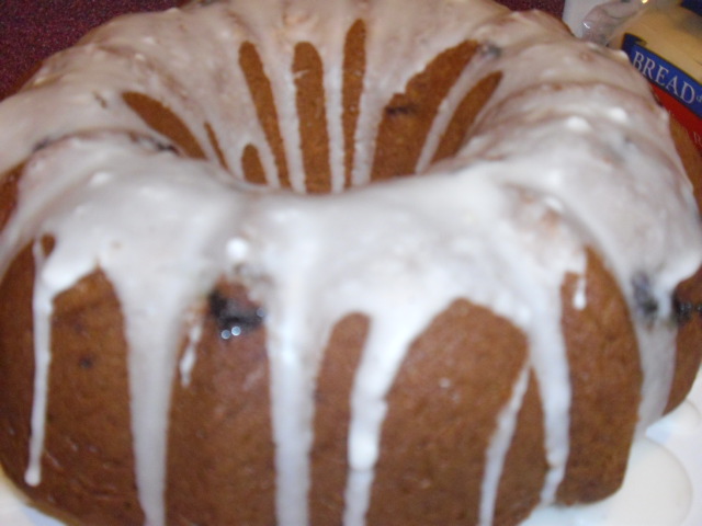 Preheat oven to 350 F. Mix first 4 ingredients well. Fold in blueberries- these may be dusted with powdered sugar or flour to keep them from all sinking to the bottom. Bake for 1 hour in a tube or bundt pan which has been greased and floured. Allow cake to cool. Mix the glaze and drizzle over cake.