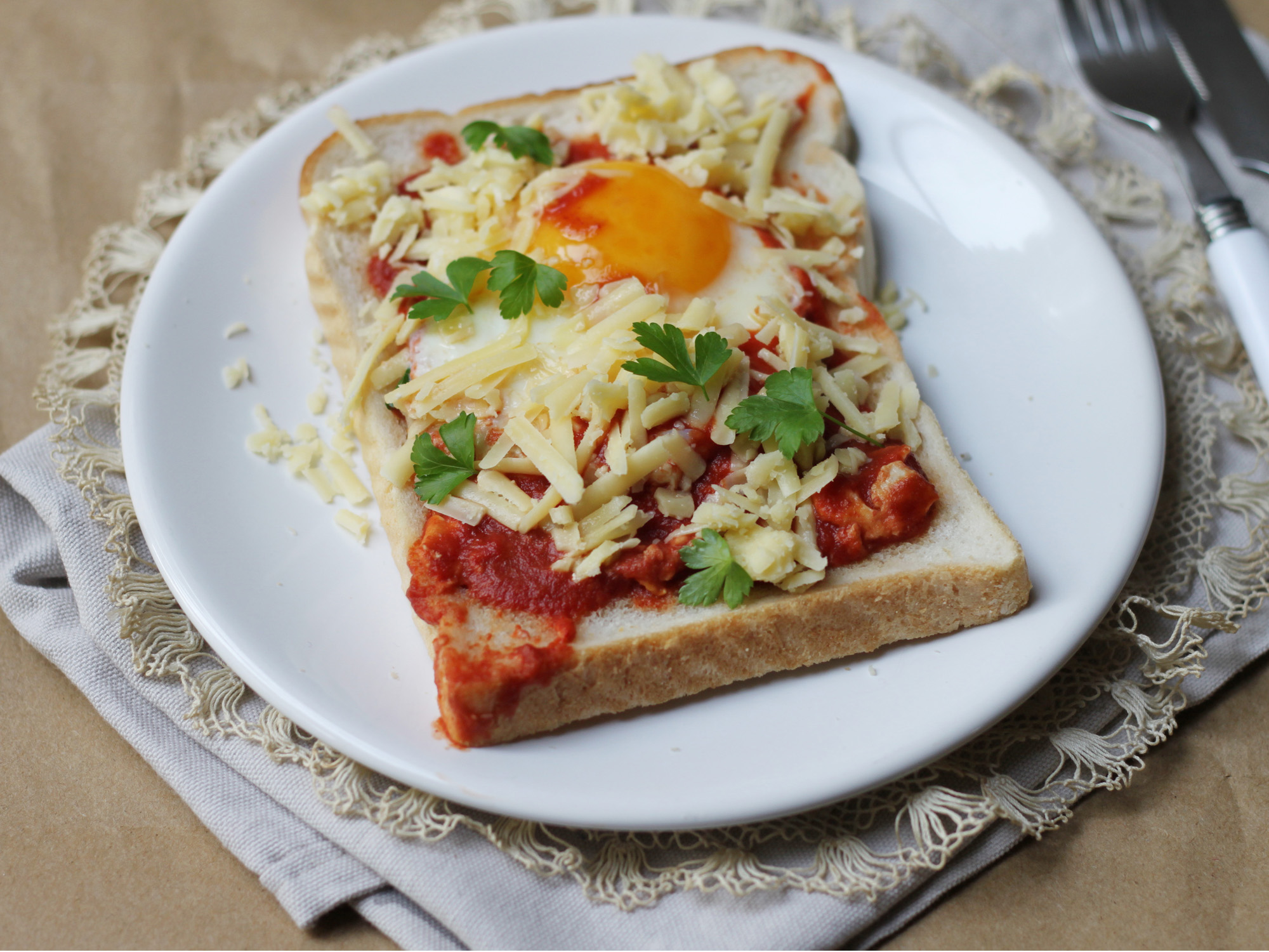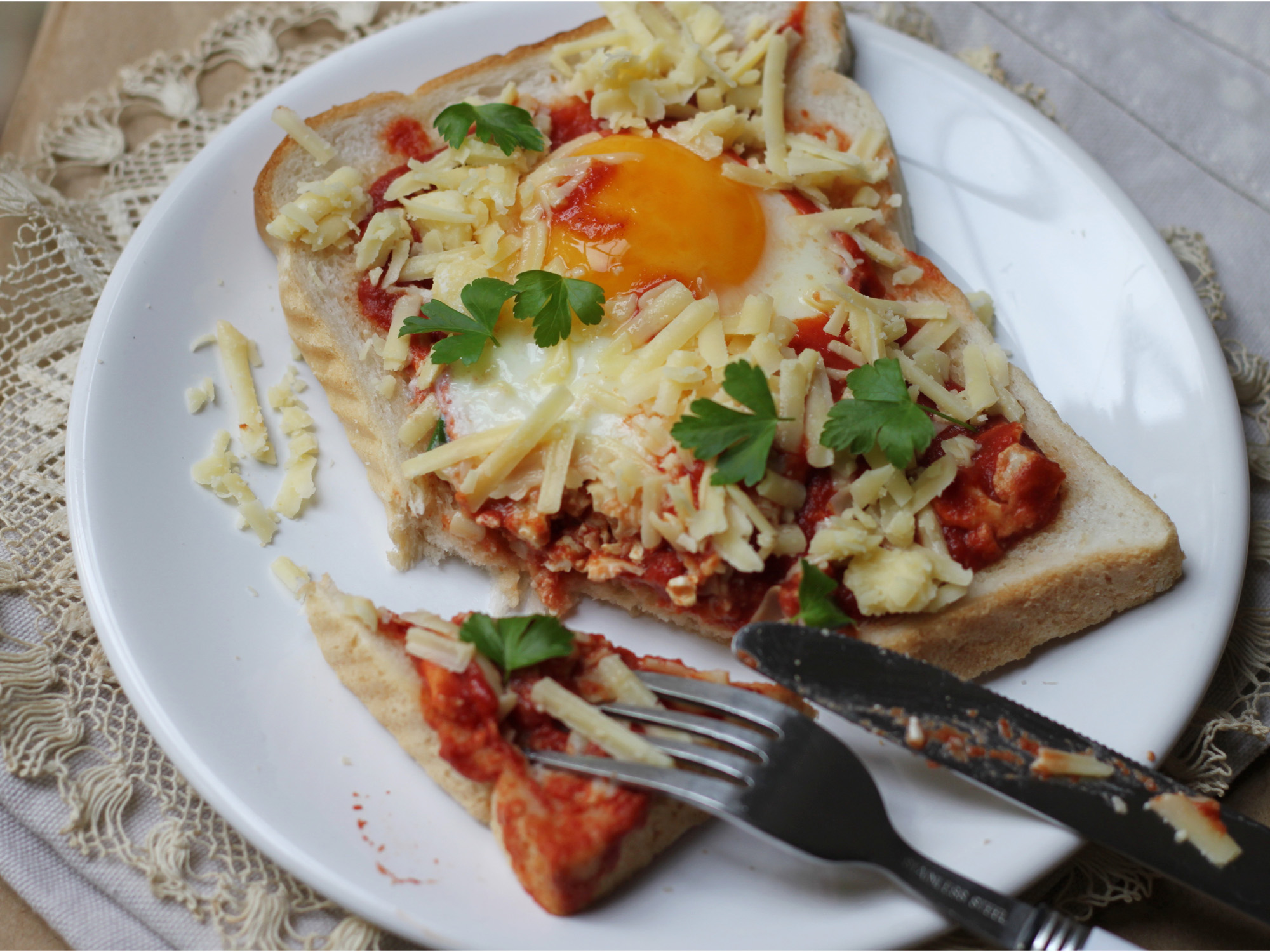 2 eggs 1?3 cup catsup 1?3 cup water 1 tablespoon vinegar 1 tablespoon butter 1?3 cup cheddar cheese 2 slices toast