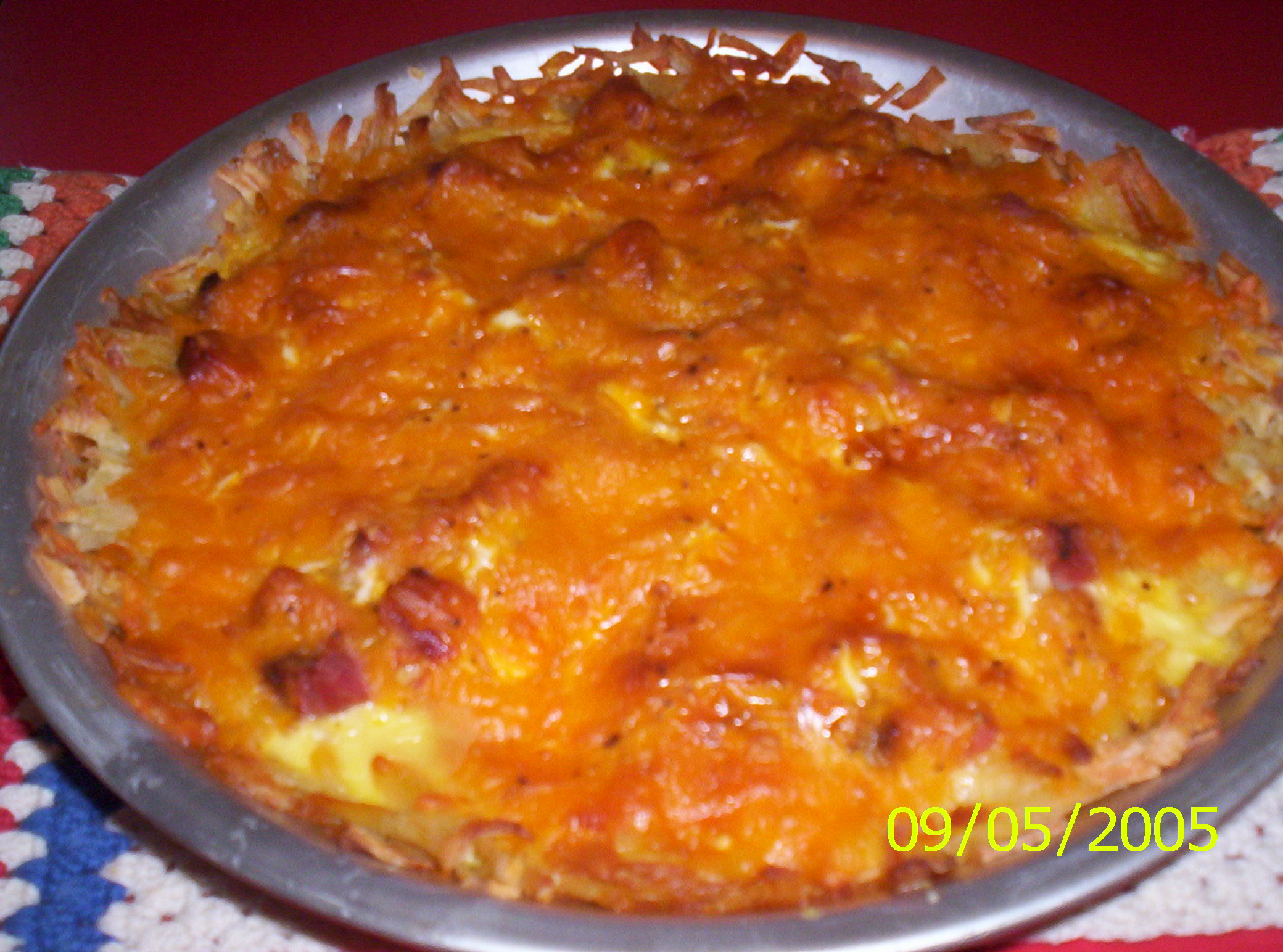 3 cups frozen shredded hash browns, thawed and drained well 1?3 cup butter, melted 1 1?2 cups cooked ham, diced into very small pieces 1 1?2 cups shredded sharp cheddar cheese 2 eggs 1?2 cup milk 1?2 teaspoon salt 1?4 teaspoon fresh ground pepper