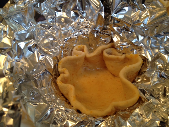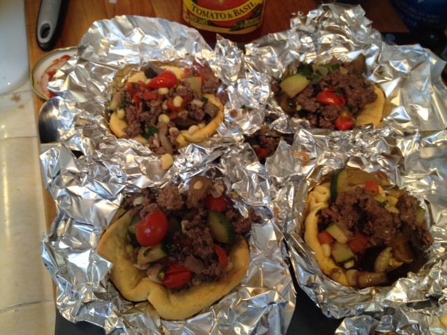 For the bowls: Pre-heat your oven to 350 deg. F. Using a non-stick 6 compartment muffin tin, cut 6, 12 x 12 sheets of aluminum foil and fit into each of the compartments. Roll down the excess foil leaving about an inch sticking above the top of the muffin tin. On a floured board, take out 6 of the biscuits and roll them out until they are about 3 times their original size. Set each one into the compartments forming a cup. Mix the melted butter and garlic powder together and brush onto the surfaces of the dough. If you have small, oven proof bowls that are about the size of the compartments, grease the underside of the bowls and set gently into each cup. This will give you a larger cup when its baked. If not, youll have to open up the cups a little by hand when they are removed from the oven. Put the muffin tin into the oven for 12 minutes. Remove from the oven and set aside. They will not be completely baked but they will be going back into the oven. Leave the oven on. For the filling: In a heavy skillet, heat the olive over medium high heat. Add the onions and saut for 2 3 minutes. Season the ground beef with a little salt and pepper and break up into the pan. Stir to combine the meat and onions. Add the red peppers, zucchini, eggplant, and corn. Season with salt and pepper to taste, combine all ingredients and lower heat to medium. Continue cooking for 4 to 5 minutes to allow the meat to start cooking through. Add the garlic, tomatoes and red pepper flakes. Combine. Add the wine, basil and oregano and cook for 2 to 3 minutes until everything is cooked through but not too soft. You want the veggies to still have some crunch to it. Turn off the heat and take off the stove. Using a slotted spoon to avoid taking up too much liquid, spoon some of the meat and veggie mixture into each of the biscuit bowls, filling them to just above the top. Heat the pasta sauce slightly. Using a regular tablespoon, spoon on 3 4 tablespoons of the pasta sauce and top with some of the grated cheese, leaving some for when it comes out of the oven. Put the muffin tin back into your 350 deg. oven and bake for another 5 7 minutes until the cheese is melted. Remove the pan from the oven. Carefully remove each bowl with the aluminum foil around it and place on serving plates, one or two per diner. Roll the foil down exposing the entire bowl. Sprinkle on the remaining cheese. The bowl can be picked up by hand or eaten with a knife and fork (Make sure you dont get any of the foil).