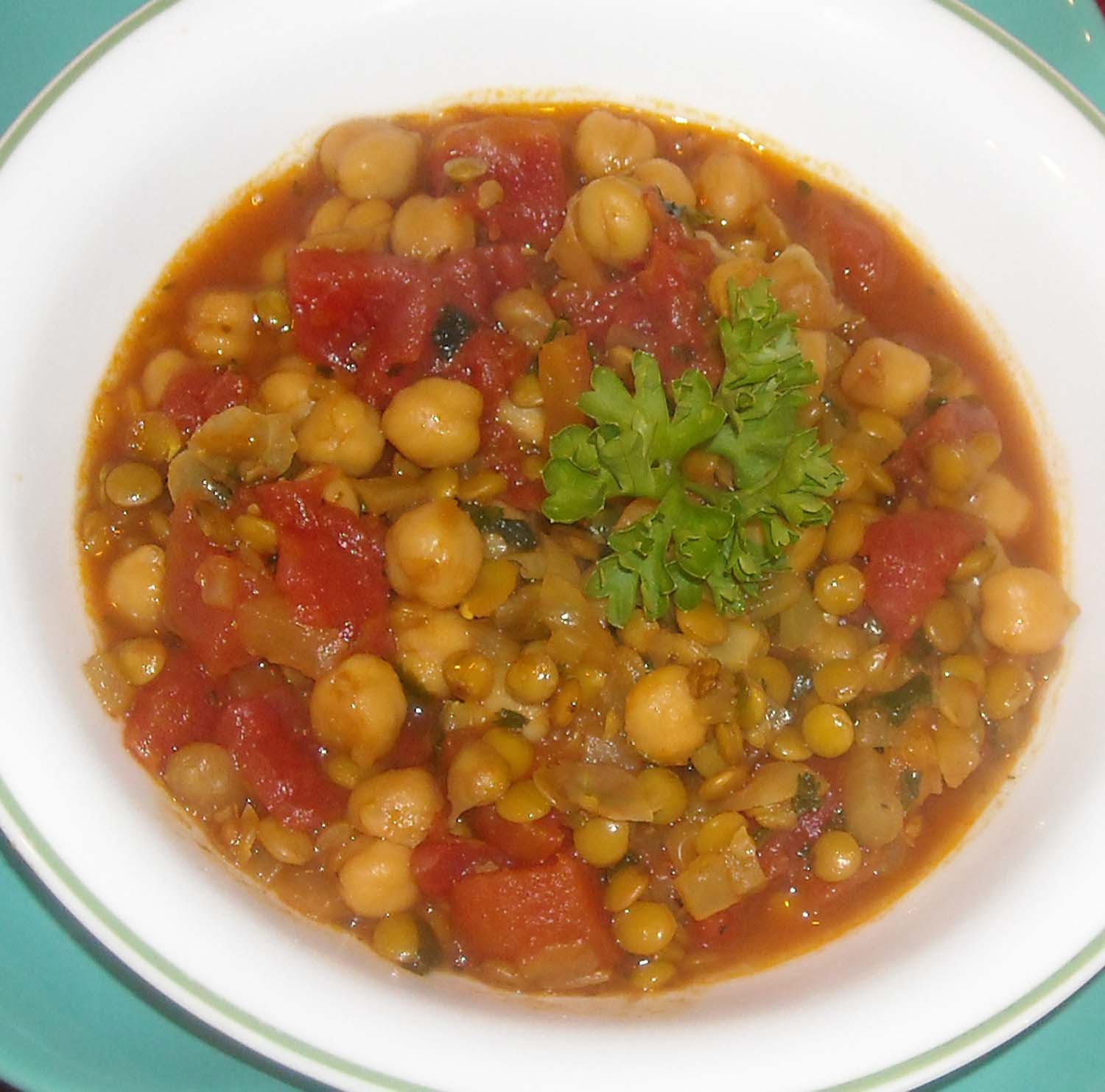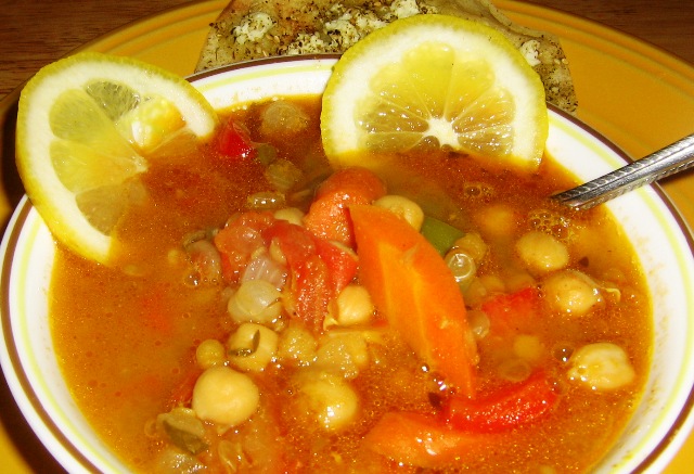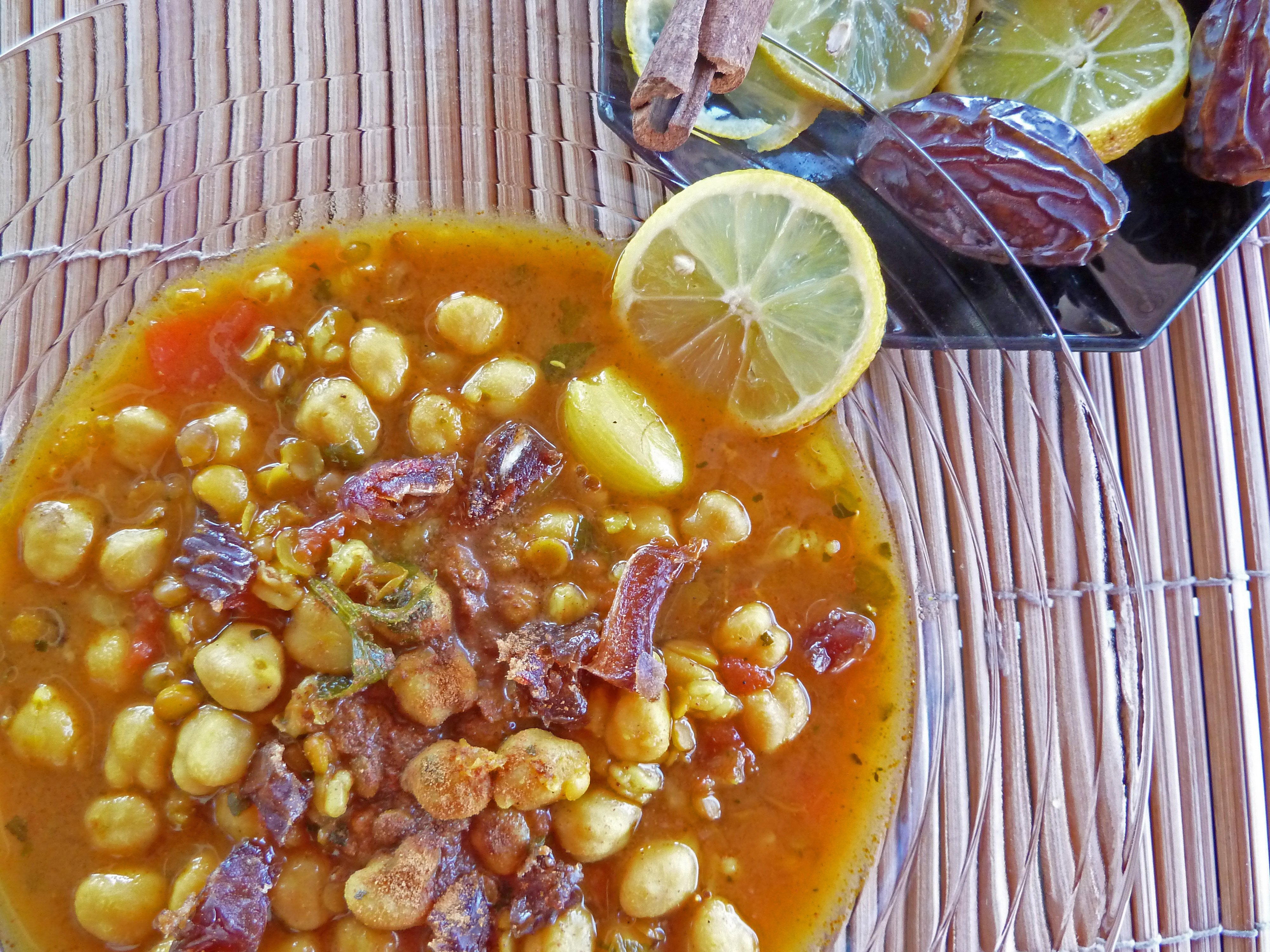 1?2 bunch cilantro, fresh 1?2 bunch parsley, fresh 4 cups chicken broth 1?2 cup green lentil (or brown) 0.5 (19 ounce) can chickpeas, drained and rinsed 1 (19 ounce) can tomatoes, drained and chopped 1 onion, chopped 1 teaspoon cinnamon 1?2 teaspoon ground cumin 1?2 teaspoon ground ginger 1?2 teaspoon turmeric 1?2 teaspoon black pepper 2 tablespoons lemon juice 1 tablespoon olive oil GARNISH 1 tablespoon cinnamon 1 lemon, thinly sliced 6 pitted dates, halved (optional)