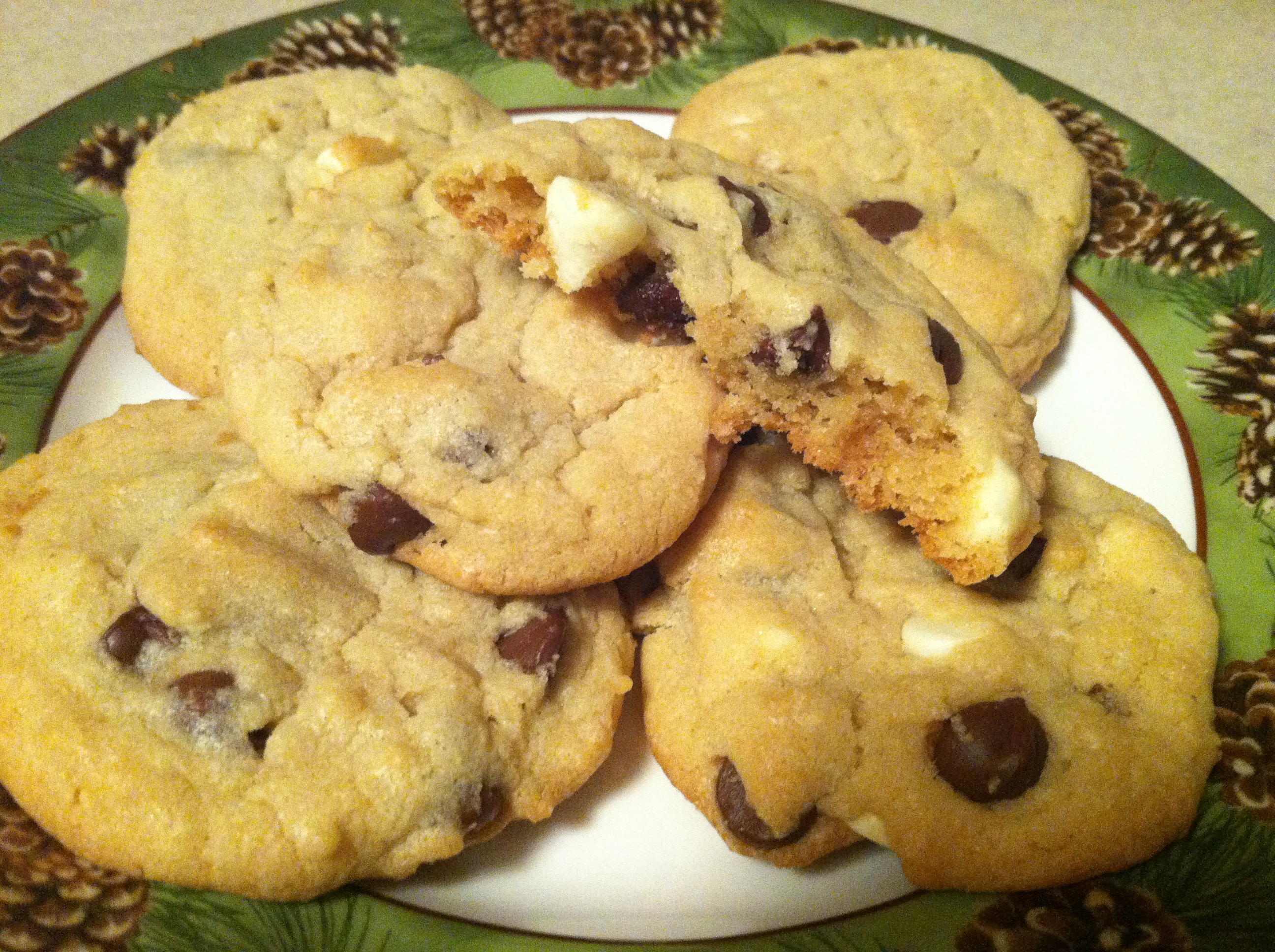 1?2 cup shortening 1?2 cup butter 3?4 cup white sugar 3?4 cup packed brown sugar 1 teaspoon vanilla 1?2 teaspoon almond extract 1 teaspoon baking soda 2 eggs 2 3?4 cups bleached all purpose flour (see note below) 1 teaspoon salt 2 cups chocolate chips (I use Ghirardelli brand)