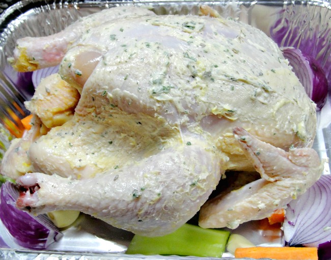 2 tablespoons unsalted butter, room temperature 1 1?2 teaspoons herbes de provence 4 lbs chicken, whole 1 large lemon, cut in half salt and pepper, to taste 1 medium yellow onion, peeled and cut into 8 wedges 1 stalk celery, cut into 8 pieces 1 large carrot, cut into 8 pieces 3 garlic cloves, peeled and left whole 1?2 cup chicken broth (or white wine)