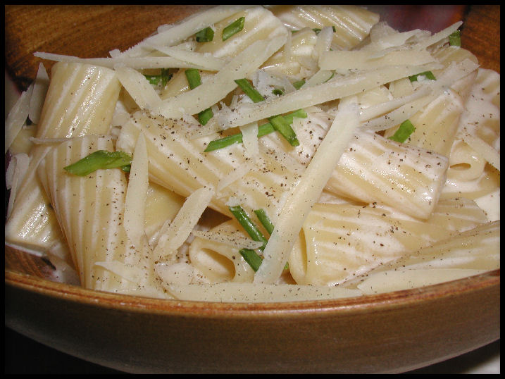 While the pasta is boiling: Melt butter in sauce pan over med-low. Add onion and garlic saute about 5 minutes. Pour in half& half, let heat through. Wisk in blue and parmesan cheeses. Salt and pepper to taste. Sauce will thicken a bit upon standing. Toss with cooked pasta.