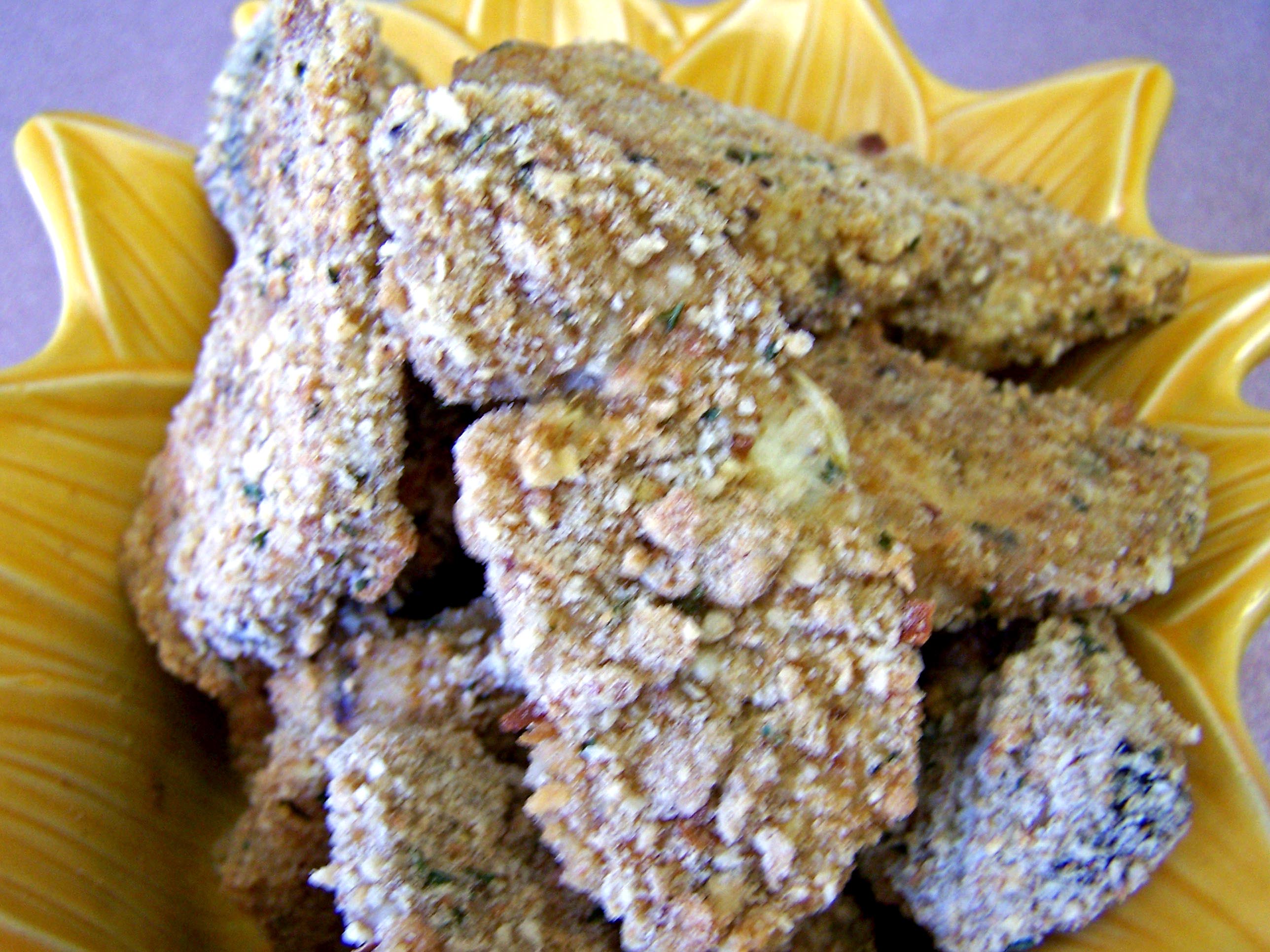 2 medium eggplants, peeled and cut crosswise (I cut 1/4-1/2 inch wide) 1 tablespoon kosher salt (I use less about a teaspoon) 4 cups breadcrumbs (best from dense white bread, French bread, preferably NOT the kind from the can) 1 cup grated parmesan cheese 1 cup all-purpose flour 1 teaspoon ground pepper 4 large eggs, beaten 6 tablespoons vegetable oil (I've used olive, too)