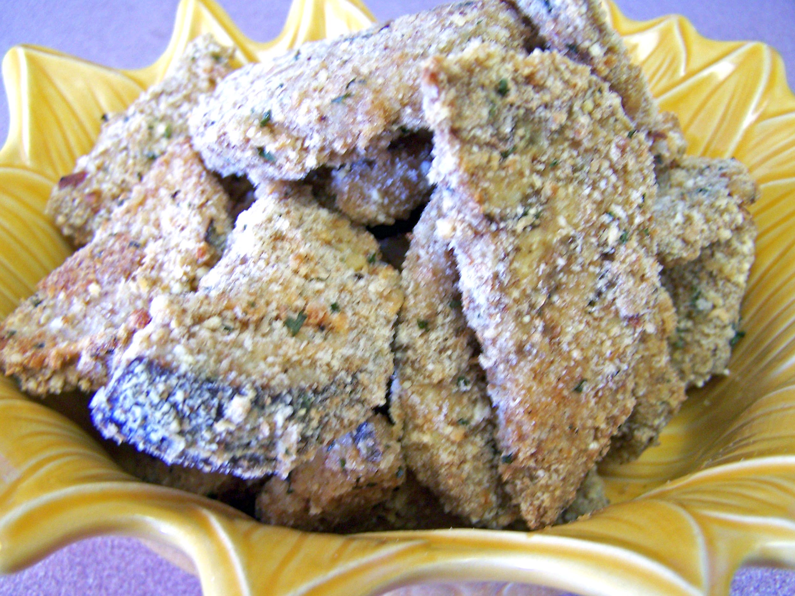 Start by draining the eggplant: layer sliced eggplant with gentle sprinkle of salt in a colander and place a plate or lid on top). The eggplant will leak out about 2 tbs. of moisture (about a half hour-sometimes I just do set it about 15 minutes and that seems to work, too). I lightly wipe excess salt off with damp paper towel. Heat oven to 425 degrees. Prepare cookie sheet/jelly roll pan with half the oil and heat in oven while dipping/breading the eggplant. Mix together flour and pepper and put in large Zip-lock bag. Mix Parmesan and bread crumbs and put in pie plate. Dipping process: Place about 10 slices at a time in flour and shake to coat lightly. Dip eggplant in beaten egg (I use a cereal bowl to dip). Dredge in bread crumb mixture. Line, without overlapping, eggplant onto cookie sheet. Bake for about 10-15 minutes until bottoms are lightly browned, and flip and finish cooking the other side. Repeat with remaining eggplant. Remove and cool on a wire rack.