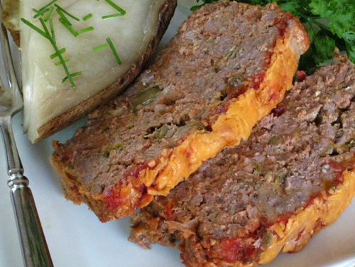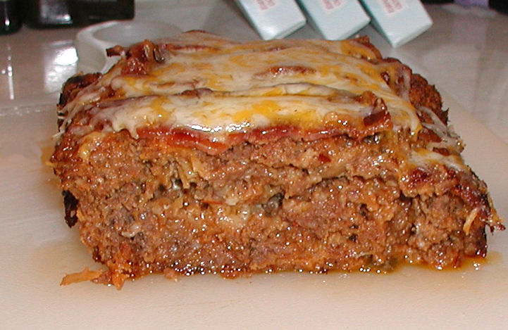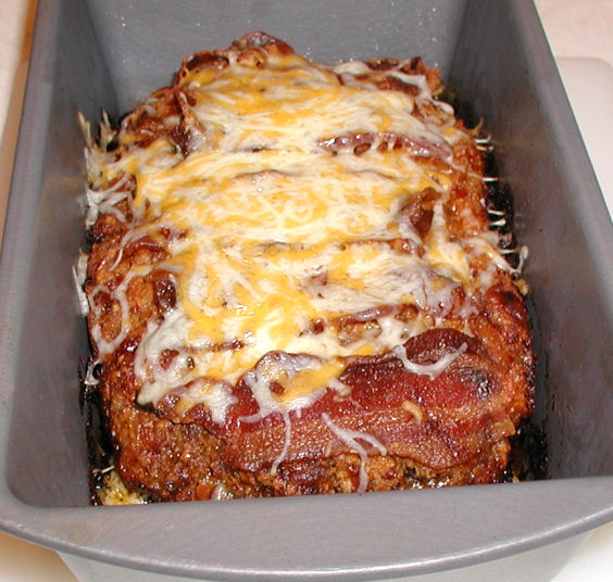 Mix all ingredients except shredded cheese for the top. Form mixture into a loaf pan. spread a very thin layer of ketchup on top. Bake at 375 for about 1 - 1 1/2 hours top with cheese, Bake until cheese melts. if the top looks too cooked cover with foil and reduce heat to 350.