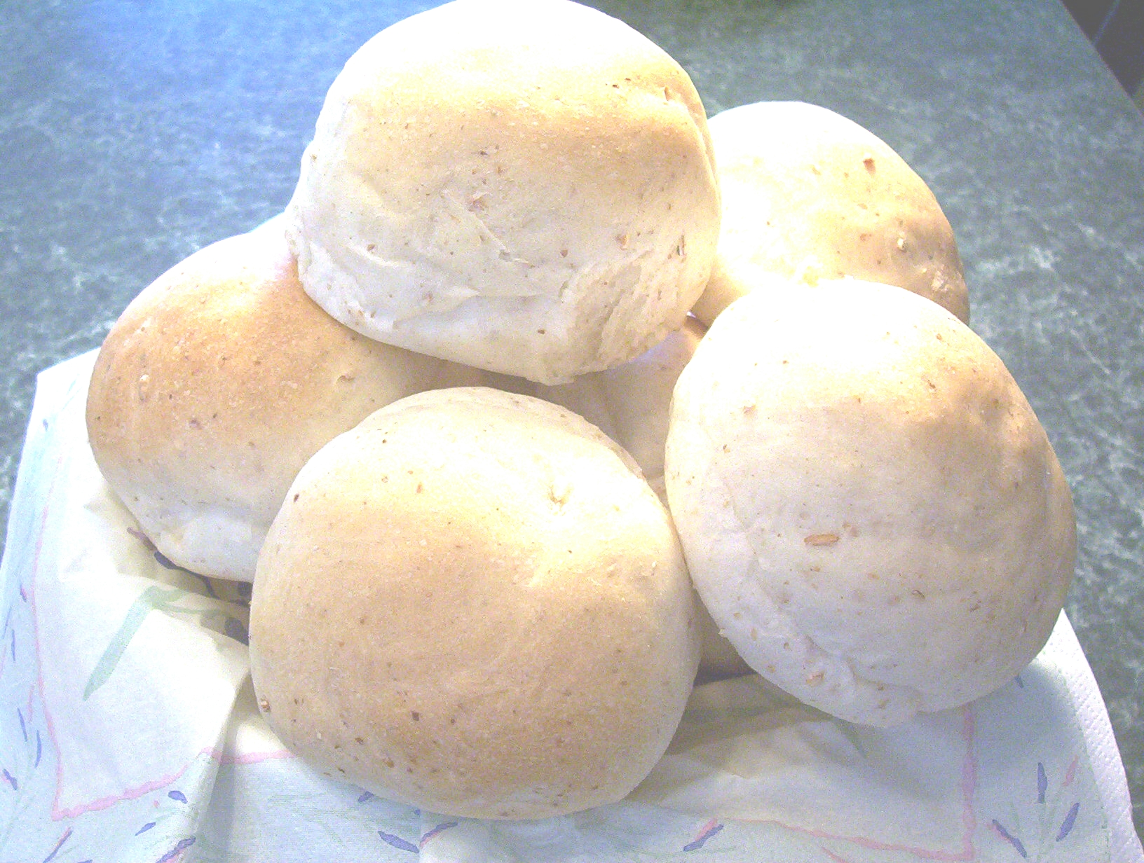 Mix Yeast items and let stand in a large bowl (I like my tupperware thatsa bowl!). Knead out until dough is soft and does not stick to your hands. Cover and let rise 45 minutes. Punch down and let rise 30 minutes. Shape into buns and let rise for 2 hours. Bake at 375 for 15-17 minutes or until golden brown.