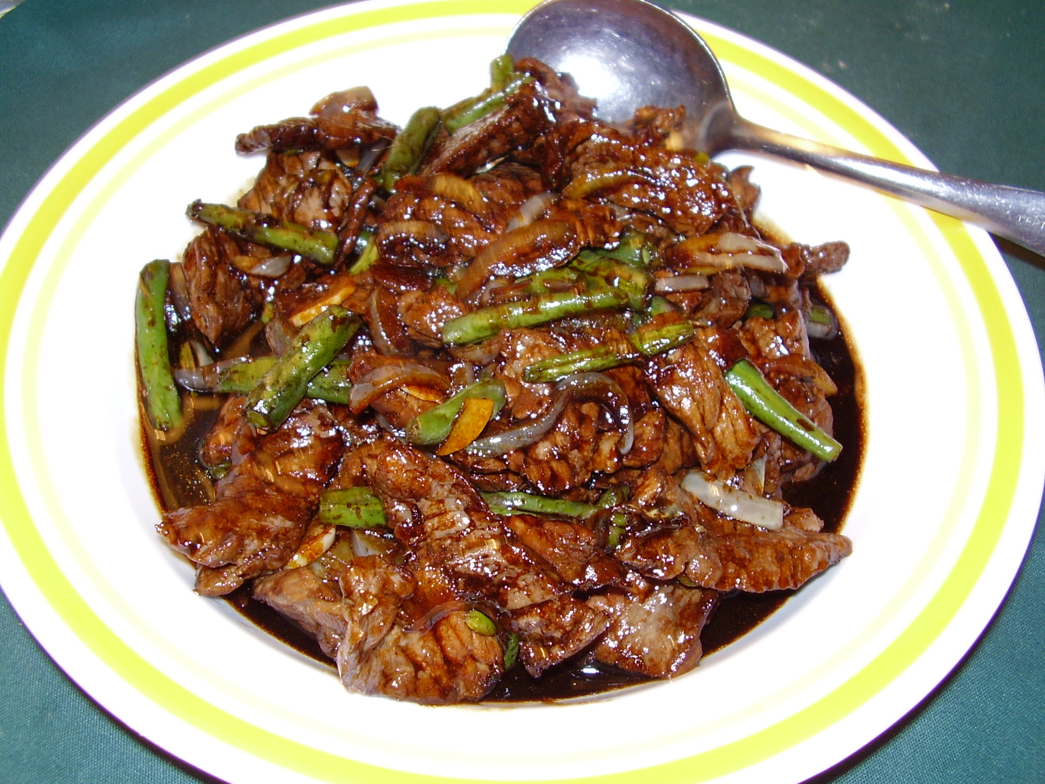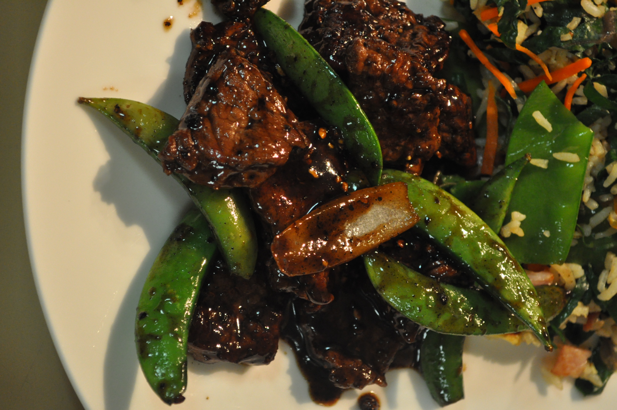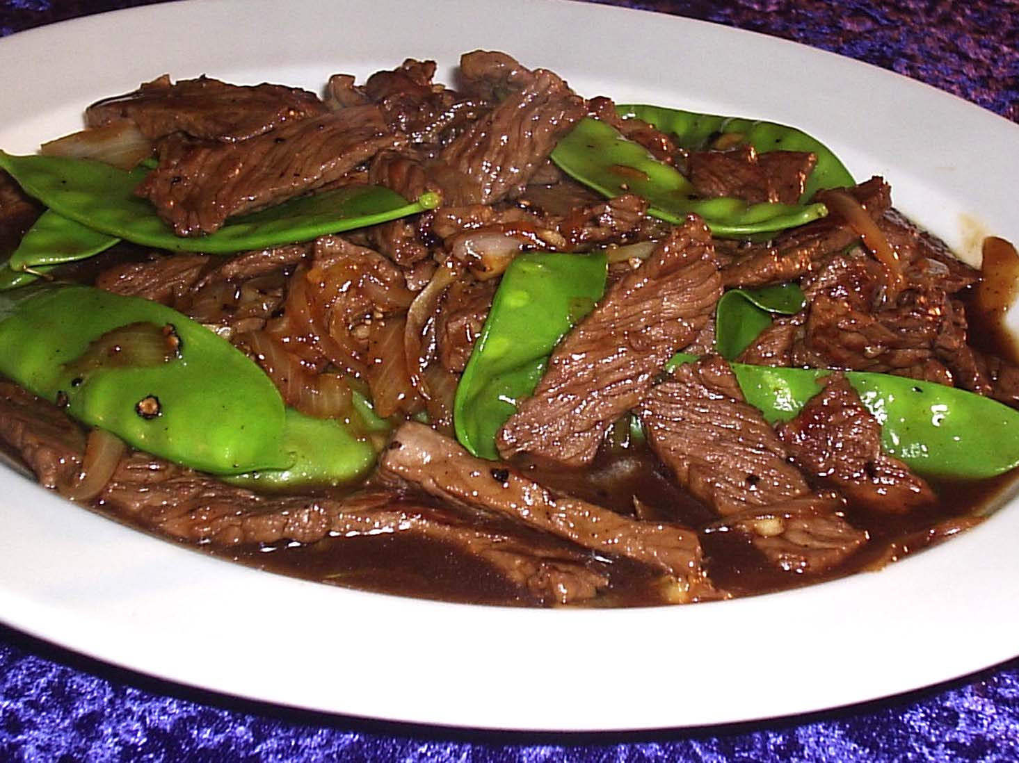 40 ml oil 500 g round steaks, cut into thin strips 1 onion, sliced into wedges 300 g sugar snap peas 40 ml honey 40 ml soy sauce 40 ml oyster sauce 1 teaspoon of freshly cracked black pepper (the original recipe called for 3 but we found it too peppery)