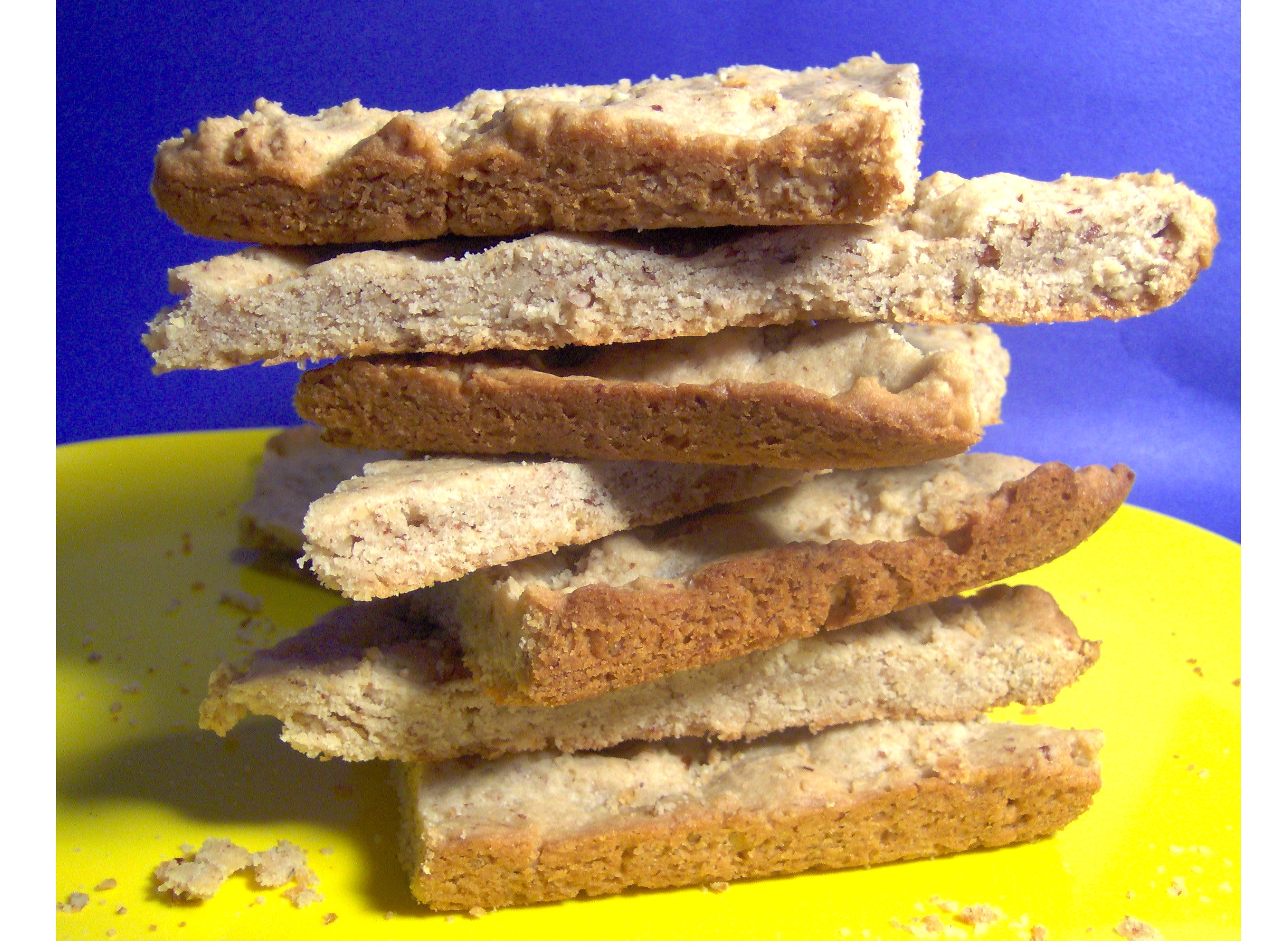 Preheat oven to 325. Grease a 9" baking pan (square or round). In a mixing bowl, beat together butter, brown sugar and vanilla. Gradually beat in pecans and flour. Press mixture into prepared pan and prick top with tines of a fork. Bake at 325 for about 30 minutes or until slightly browned and puffy. Remove from the oven and carefully cut into wedges using a sharp knife BEFORE allowing it to cool.