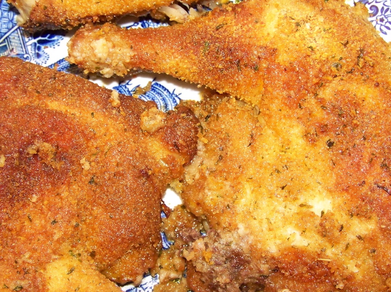 1 cup all-purpose flour 2 cups fine dry breadcrumbs 2 teaspoons cornstarch 2 teaspoons paprika 2 teaspoons onion powder 2 teaspoons salt 2 teaspoons sugar 3 1?2 teaspoons poultry seasoning 2 tablespoons crumbled dried parsley 10 teaspoons vegetable oil 6 pieces cut-up chicken