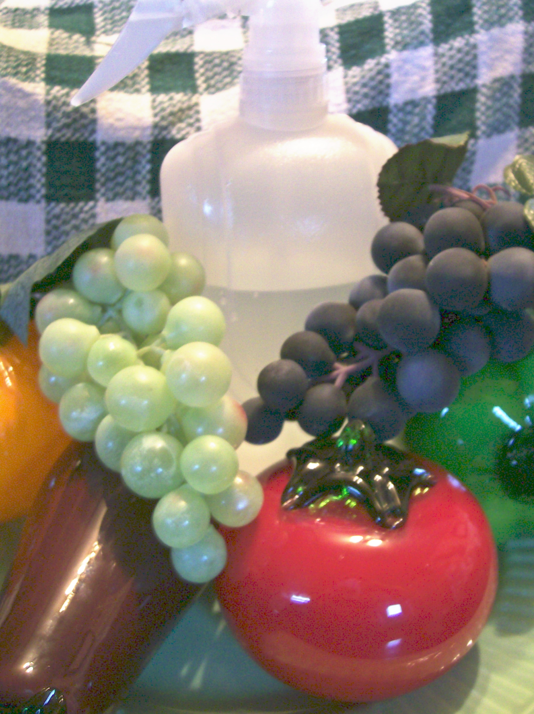 Mix all ingredients together in a DEEP pitcher. See note above! Pour into a spray bottle. Spray on fruits and or vegetables and allow to sit for 5 or 10 minutes before rinsing.