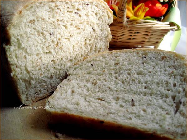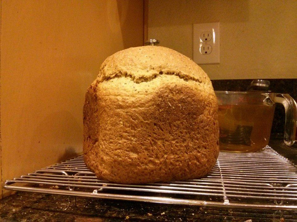 PUt ingredients into the bread machine according to manufacturer's directions. Bake on basic white 1. 1.5 pound setting.