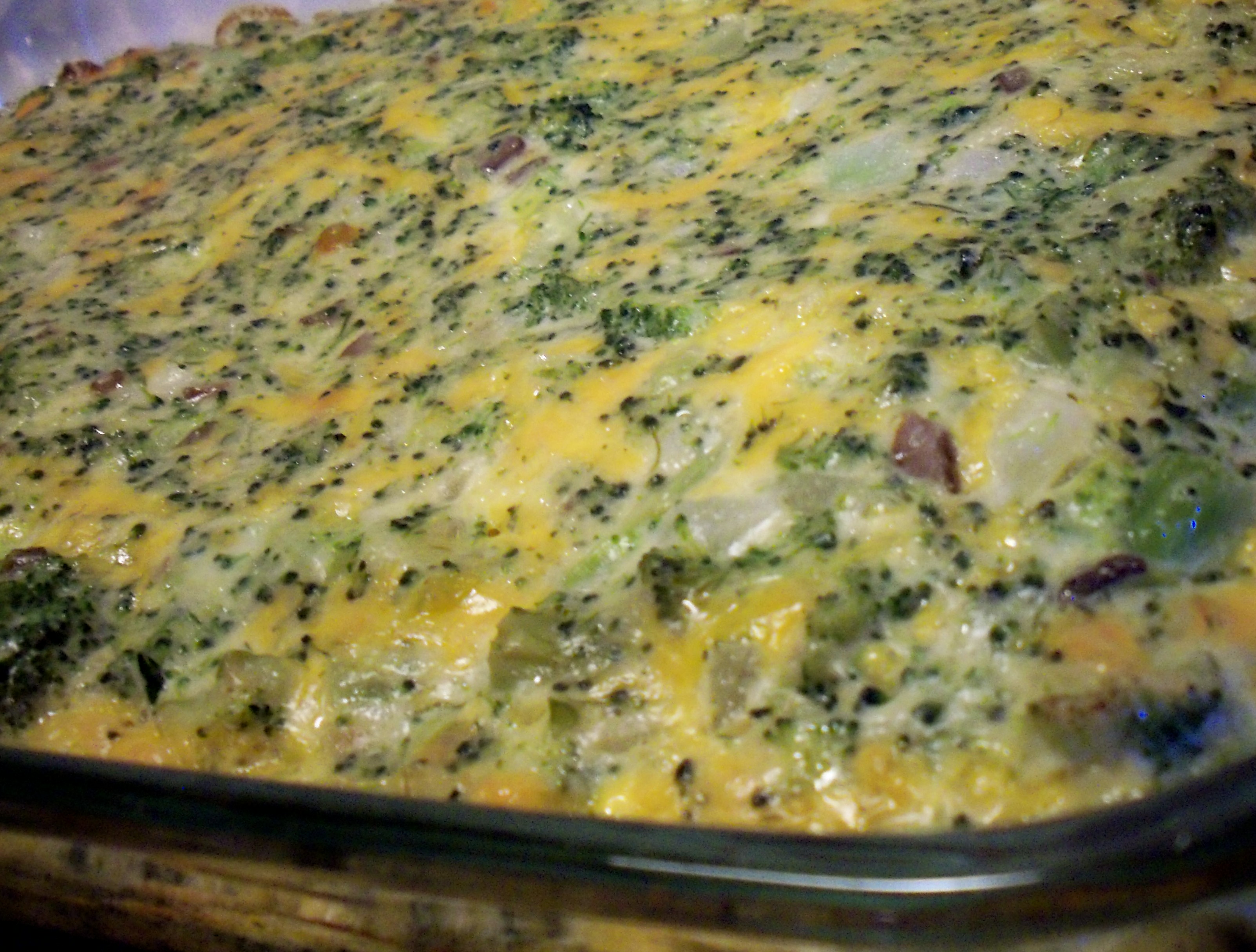 In a medium sauce pan, cook broccoli and onion until tender, drain. In large bowl add remaining ingredients. Add broccoli and onion. Mix well. Put in a 13x9 baking dish. Bake at 350 for 30-45 minutes .