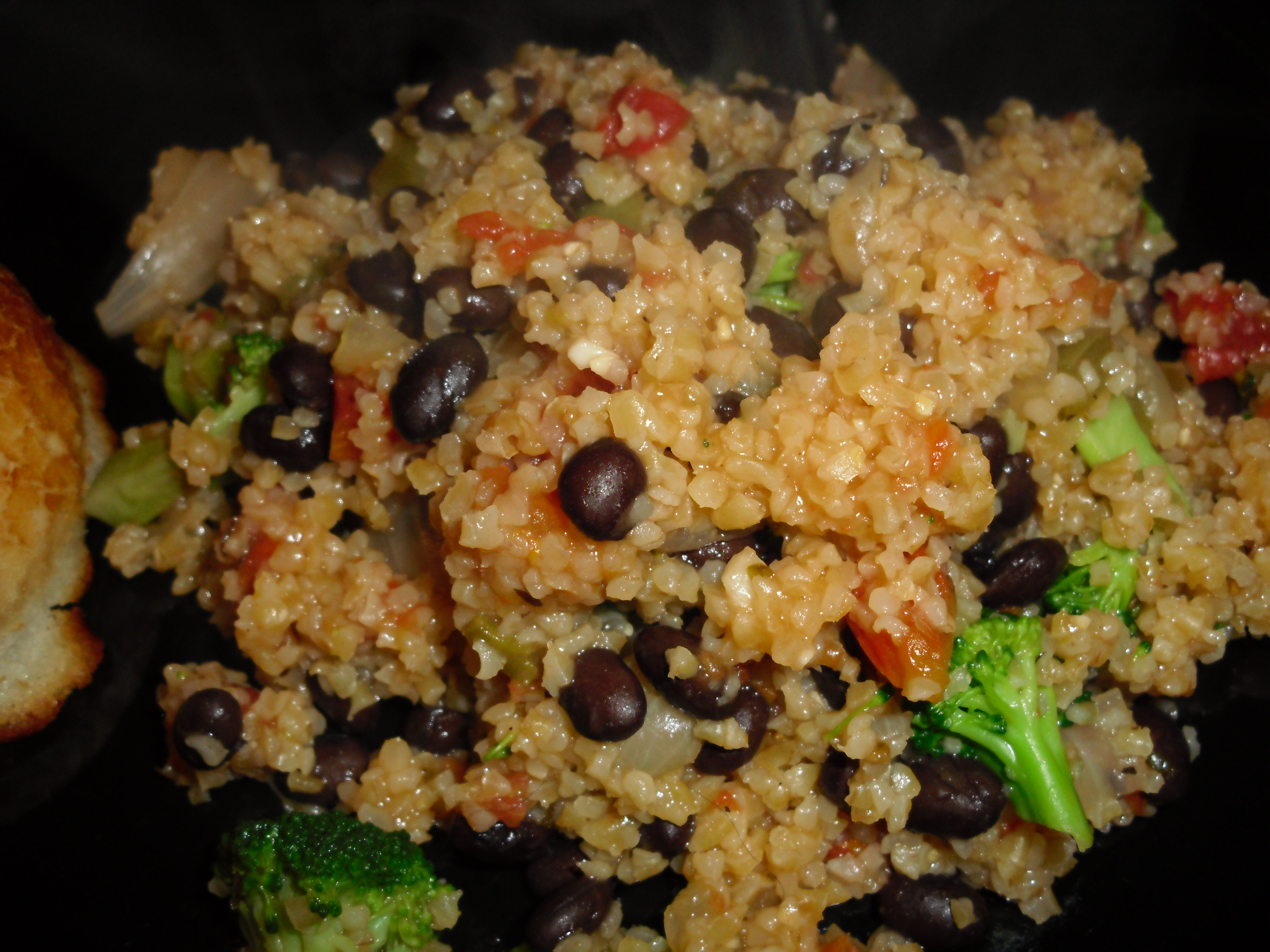1 cup broccoli floret, cut small 1 onion, chopped (use a small onion) 2?3 cup frozen green bell peppers or 1 fresh green bell pepper, chopped 1 clove garlic, minced 1?2 tablespoon olive oil 1 cup canned tomato 1 cup bulgur 3?4 cup canned black beans, rinsed and drained dried oregano (optional) salt, to taste pepper, to taste 3?4 cup hot water