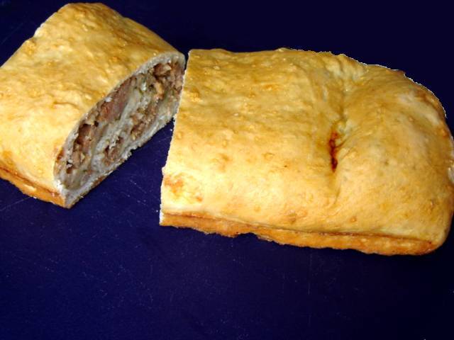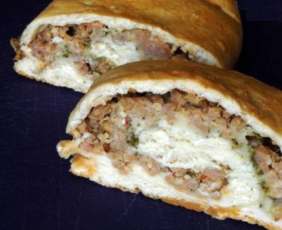 Thaw dough in refrigerator overnight or room temperature until just soft enough to yield to pressure of a fingerprint. (I doubled recipe #28008 and used it with success). Meanwhile prepare filling, place sausage and onion in a large skillet, cook 10 minutes stirring often breaking meat up with the side of a spoon. (If the meat doesn't want to break up -- convince it!). Pat out 1 piece of dough to flatten on a lightly floured surface. Roll dough into a 14x9 inch (or there abouts) rectangle. (Turn dough so that the long side is directly in front of you.) Sprinkle half of the cooled sausage, cheeses and parsley on the dough, leaving an inch or two from the far edge. Roll up dough, starting with the long side, enclosing like a jelly roll. Transfer roll, seam side down, to a lightly greased cookie sheet and tuck ends under. Repeat with remaining dough and filling. Brush the tops of both loaves liberally with egg mixture, sprinkle with sesame seeds if you wish. (Mom always did). Bake in a moderate oven, 375, for 20-30 minutes or until crust is golden brown. Remove loaves to a serving platter and cut into 1 1/2 inch slices and serve.