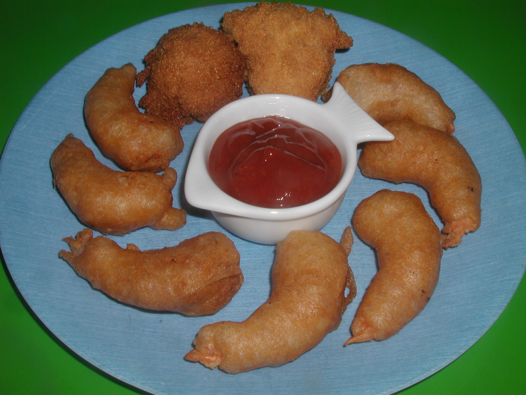 Measure out 2 1/4 cups of the mix (keep leftover mix for later use). Combine the mix with eggs and onion, mixing well. Drop batter by tablespoonfuls into hot oil (370). Turn when golden brown and fry on other side till golden. Remove with slotted utensil and drain on paper towels.