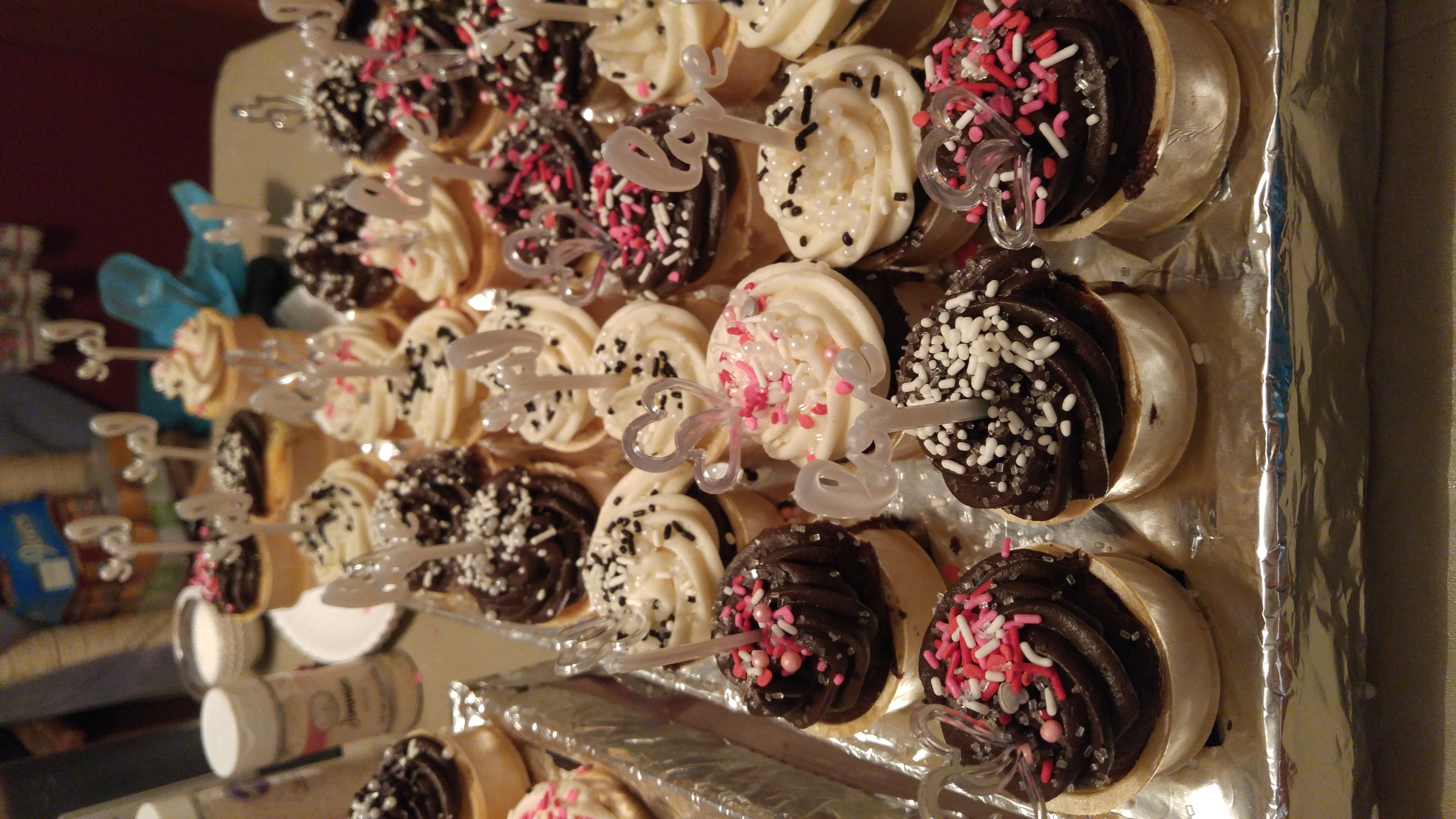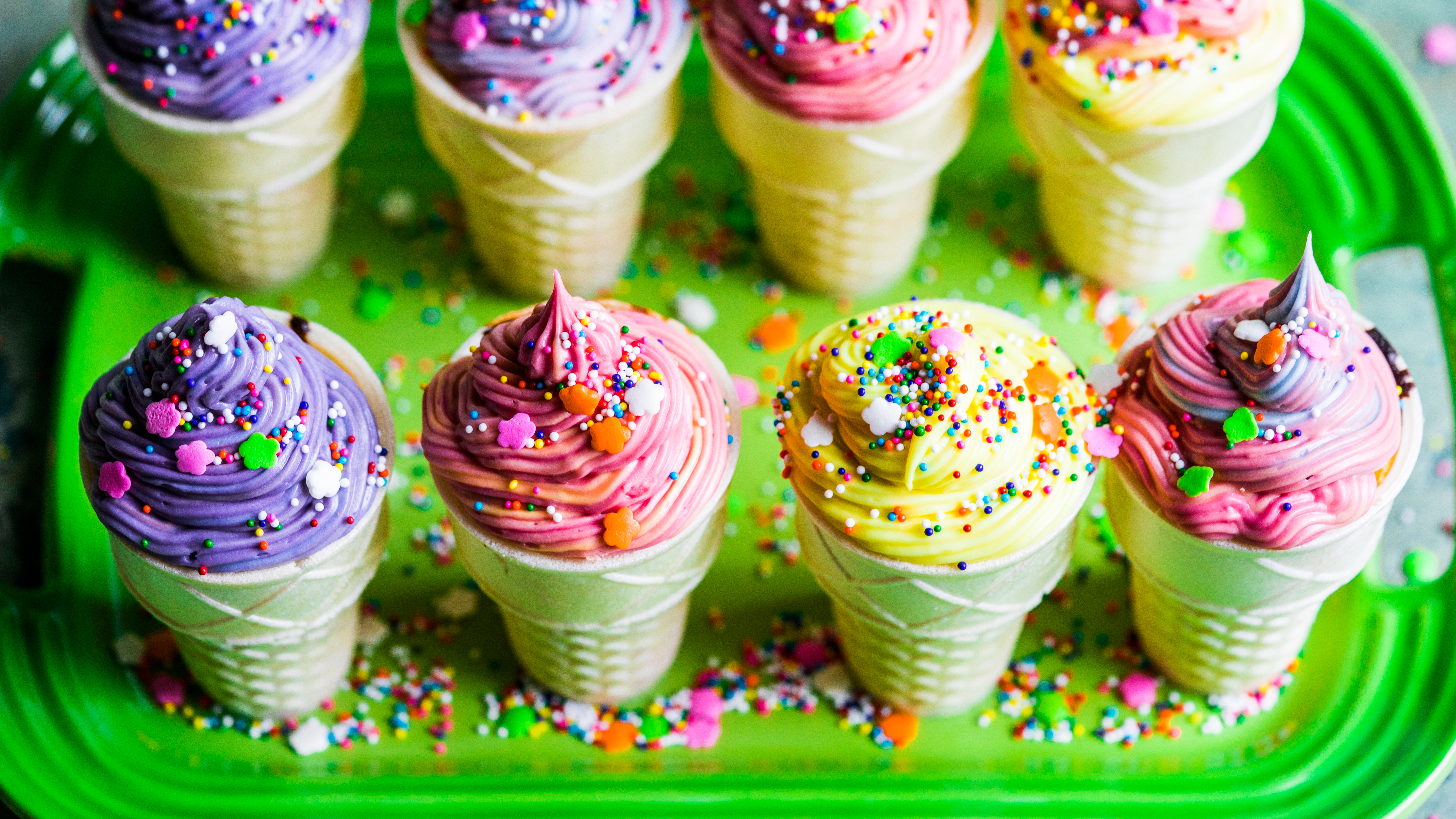 Heat oven to 400F. Prepare batter for cupcakes per instructions on the box. Pour scant 1/4-cup batter into flat-bottomed ice cream cones so they are a little less than half full, or about half full; if you fill the cones too much, the cakes will not have a nice, round top. Place the cones on a baking sheet and bake for 15 to 18 minutes. Cool and frost, then decorate with sprinkles as desired.