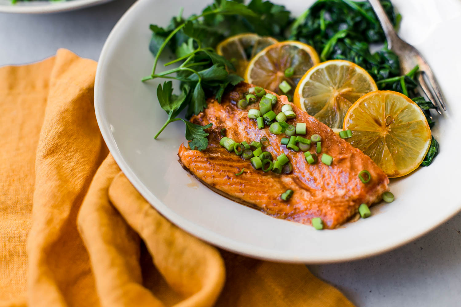 1 teaspoon ground ginger 1 teaspoon garlic powder 1?3 cup reduced sodium soy sauce 1?3 cup orange juice 1?4 cup honey 1 green onion, chopped 1 1?2 lbs salmon fillets