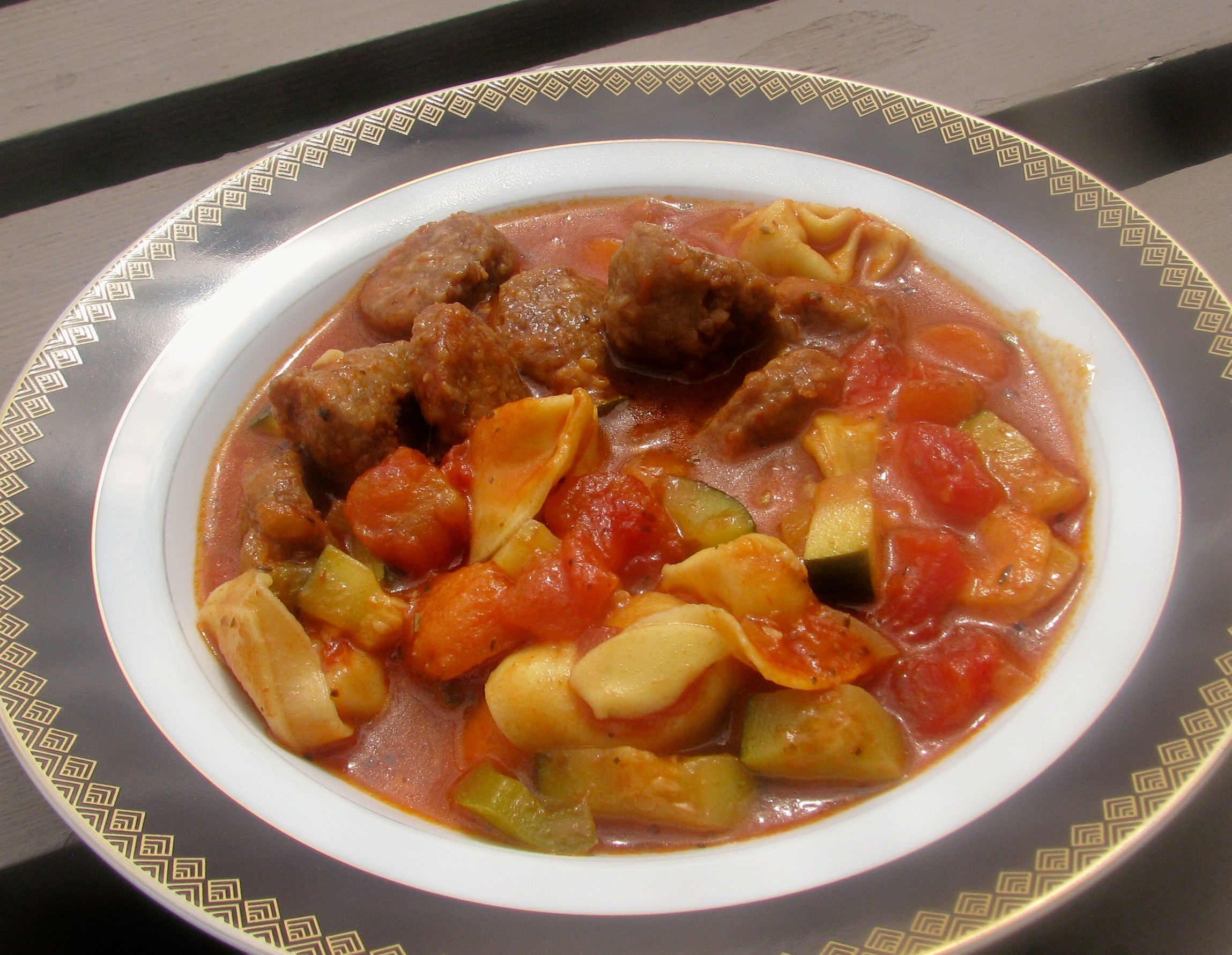 1 lb Italian sausage, casings removed 1 cup chopped onion 3 garlic cloves, minced 5 cups beef broth 2 cups chopped tomatoes 1 (8 ounce) can tomato sauce 1 large zucchini (chopped or sliced) 1 large carrot, sliced 1 green bell pepper, chopped 1?2 cup dry red wine 1 teaspoon dried basil 1 teaspoon dried oregano 10 ounces cheese tortellini salt and pepper fresh grated parmesan cheese