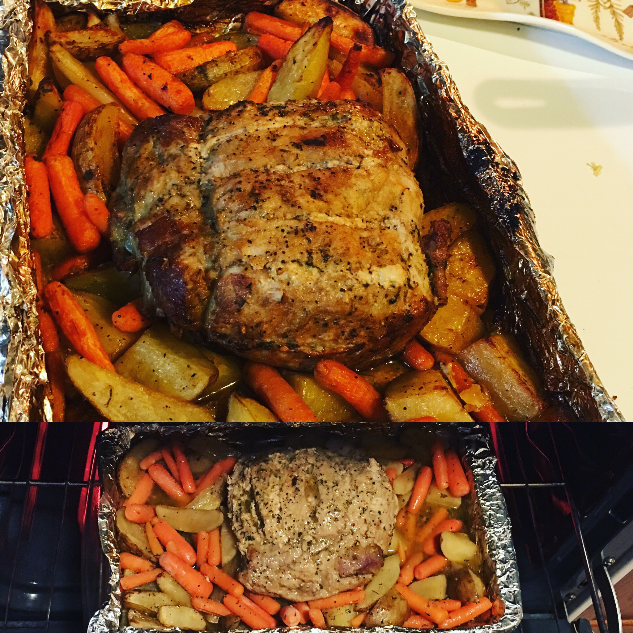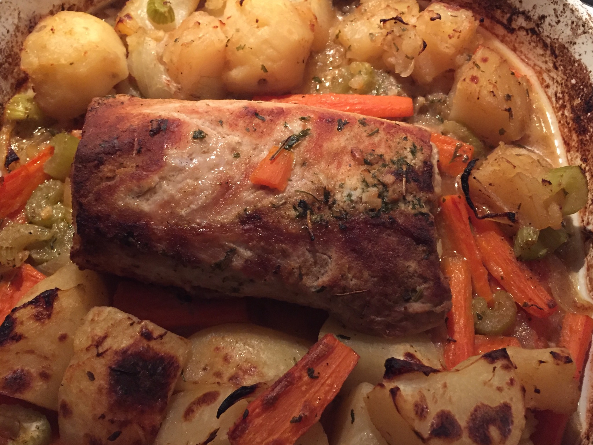1. Place Pork Loin fat side down in a 9 x 13 pan and arrange vegetables around it. 2. In a small bowl mix Garlic powder, onion powder, seasoned salt and black pepper until combined and rub it onto the pork (top only, not the bottom). 3. Sprinkle the parsley on top, and then the garlic. Drizzle the olive oil over top of the pork. You can season the vegetables as well, I recommend to. Just sprinkle all of the same dry seasonings over top. 4. Add beef broth from one of the corners of the pan, do not pour over pork. Place foil, slightly vented, over the pork, and fitting the pan. Cook it on 325 for 2 1/2 hours. Midway through rotate the pork so it it fat side up and replace the foil so it is covered again. 5. After its done take the foil off and put the broiler on HIGH. Flip the pork again to meat side up and broil for 10 minutes. You will do this twice (meat side up, 10 mins, fat side up 10 mins, and then meat side up one last time for 10 mins.) For a total of 30 minutes You may need a few mins longer depending on your oven. Just look to see how browned its getting. 6. Let meat rest for 30 minutes. 7. Enjoy! The vegetables will have an incredible flavor and so will the meat. **You may add more veggies but You'll probably have to go with a bigger pan size. **If you'd really like to kick it up, make a roux and add PAN JUICES and some red wine and let it reduce, stirring often to make a nice gravy!