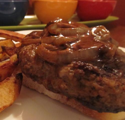 1 lb ground round 1 cup freshly grated parmesan cheese 2 egg yolks salt & fresh ground pepper 2 tablespoons butter 1?4 onion, thinly sliced 1 tablespoon olive oil 1 tablespoon butter 1?2 cup heavy cream 1 tablespoon balsamic vinegar