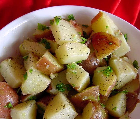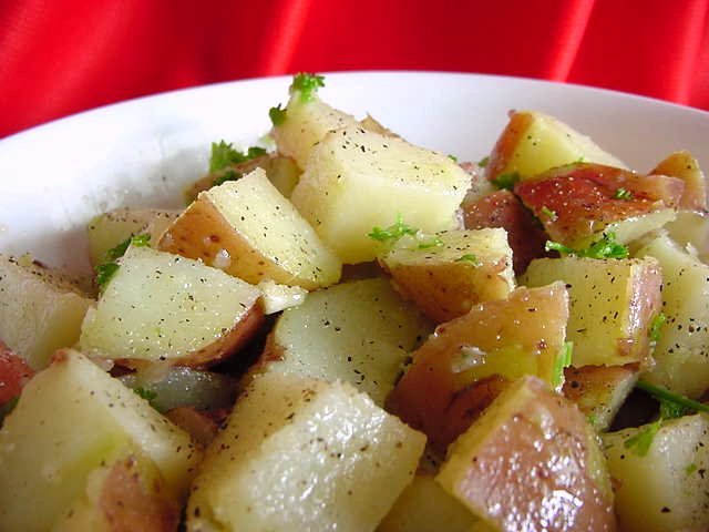 1 lb new potato, skins on (I like the small-ish ones best) 1?4 cup extra virgin olive oil 3 -4 garlic cloves (if they're really small, use 4) 1?4 cup chopped parsley salt pepper