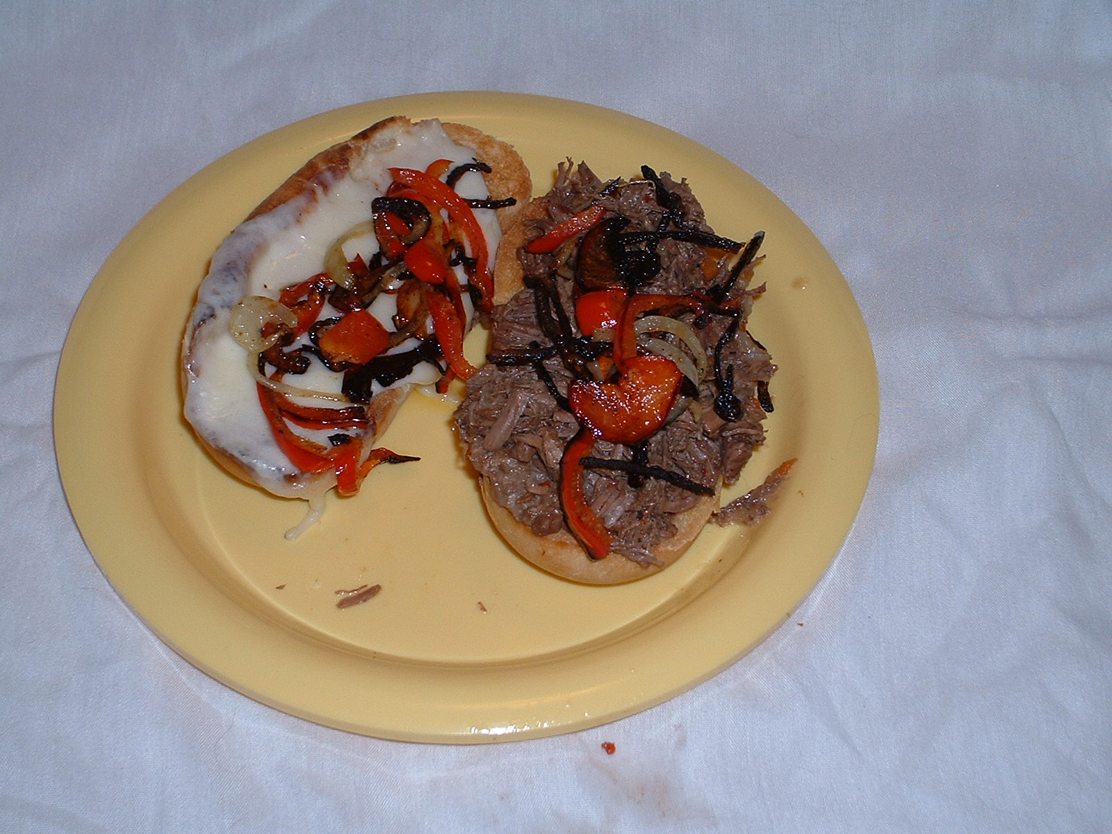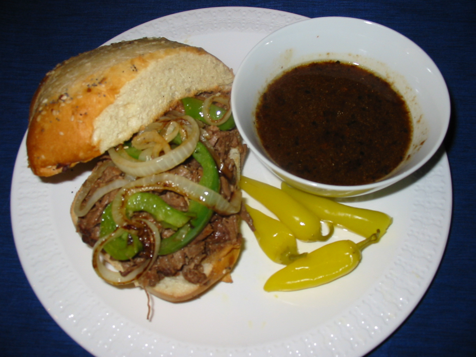Brown the beef in a small amount of oil until nice and brown. Add the remaining ingredients. Simmer until the beef is very tender and starts to shred, a MINIMUM of 3 hours. Check as it simmers to make sure it doesn't dry out. Adding more water, wine, or beef broth as needed. But not until necessary. Serve on crusty hard rolls. We sometimes like to add sauteed pepper strips and a slice of Provolone cheese.